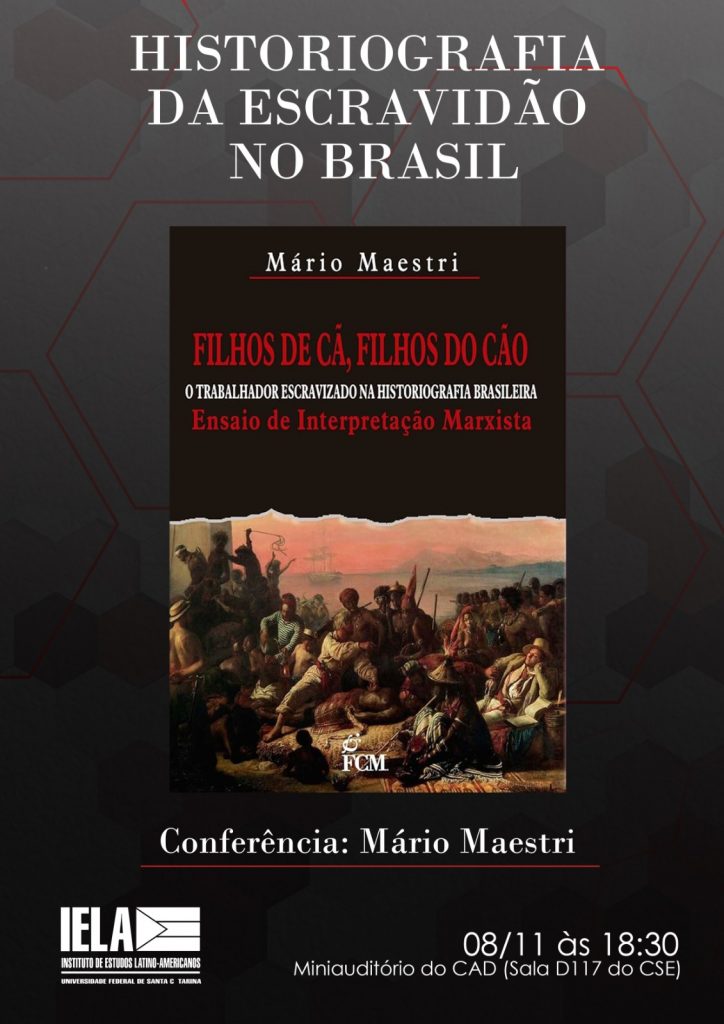 O historiador Mário Maestri, autor de obras sobre a história brasileira, falará em uma conferência na Universidade Federal de Santa Catarina (UFSC) com o título “Historiografia da escravidão no Brasil”. A palestra será nesta quarta-feira, dia 8, às 18h30, no mini auditório do Departamento de Ciências da Administração, sala D117, do Centro Socieconômico, no campus de Florianópolis. O evento é organizado pelo Instituto de Estudos Latino-americanos (Iela).