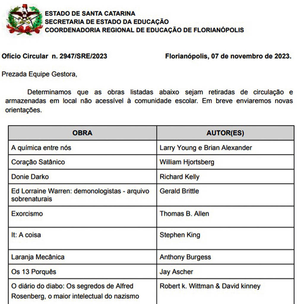 Um ofício da Secretaria de Estado da Educação com uma lista de nove livros supostamente “proibidos” circulou nesta quarta-feira, dia 8, e causou polêmica. O documento, assinado pelo Supervisor Regional da Educação, Waldemar Ronssen Júnior, e pela Integradora Regional de Educação, Anelise dos Santos de Medeiros, determina que as obras sejam “retiradas de circulação e armazenadas em local não acessível à comunidade escolar”.