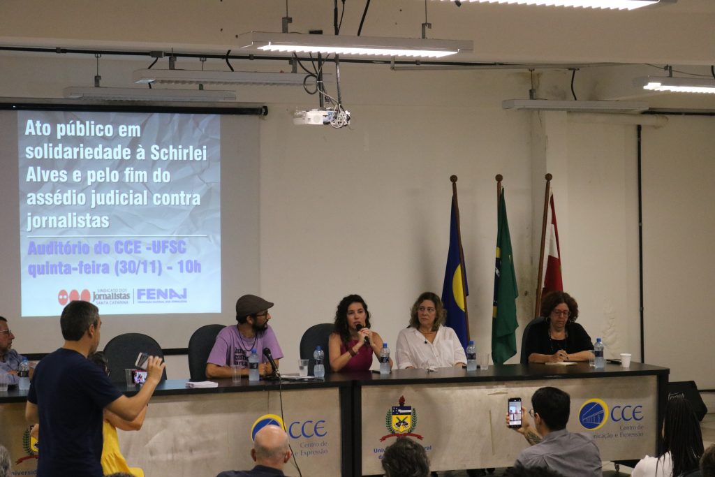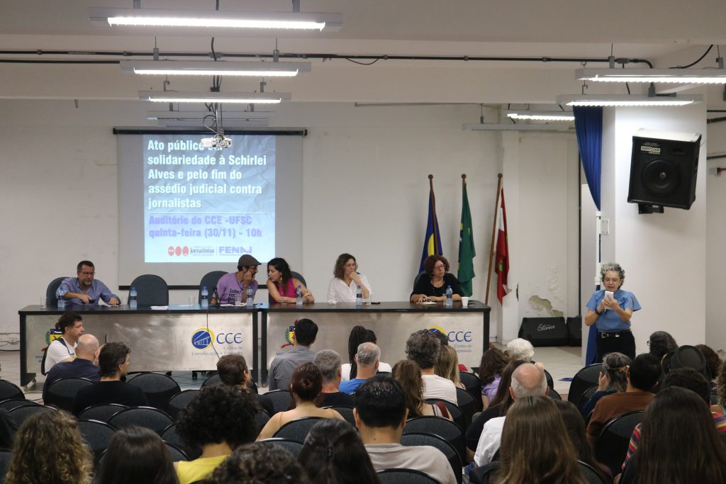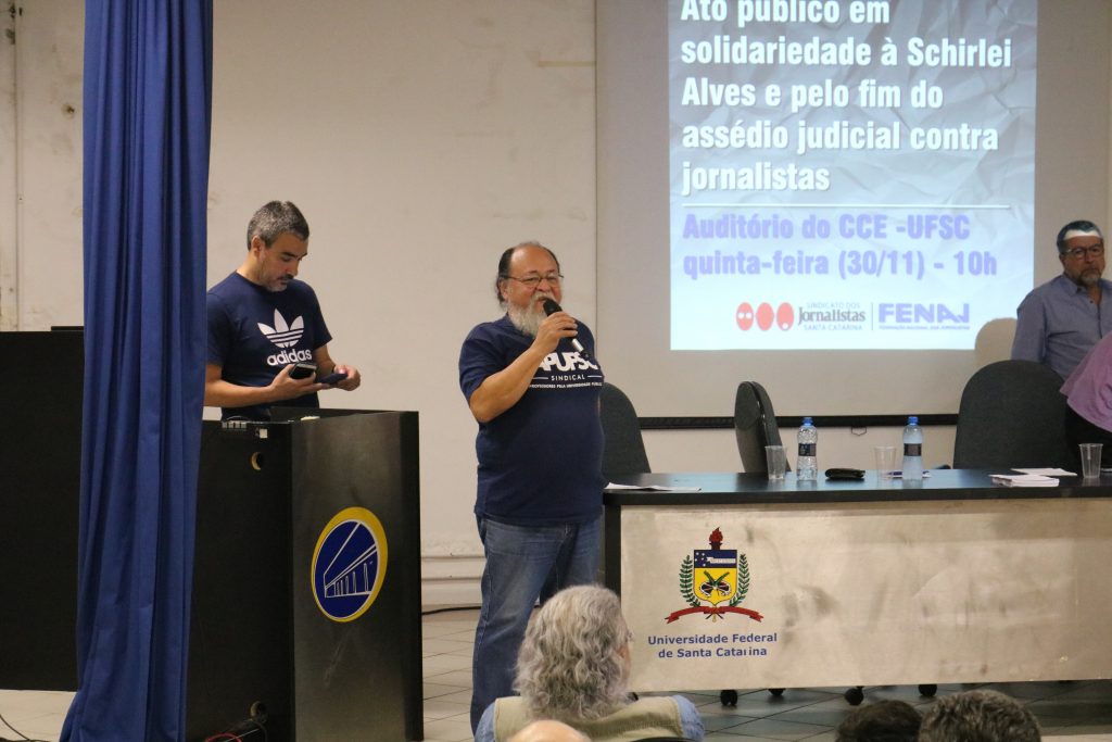 Docentes da UFSC e representantes da Reitoria também se manifestaram durante o ato. O pró-reitor de Pesquisa e Extensão, Jacques Mick, lembrou que a universidade também foi vítima de assédio judicial. “É isso que nos irmana nessa luta”, disse. O professor defendeu a necessidade de atuação conjunta em busca da transformação do judiciário brasileiro, e apontou que esse não é a única tarefa: “Santa Catarina tem ainda o desafio se voltarmos a ter o jornalismo de qualidade. Não temos jornalismo de qualidade e nem judiciário democrático”, criticou. Mick acrescentou que “o que estamos discutindo aqui são valores fundamentais”, e que “a universidade vai ser sempre um espaço para quem enfrenta essa agendas”.