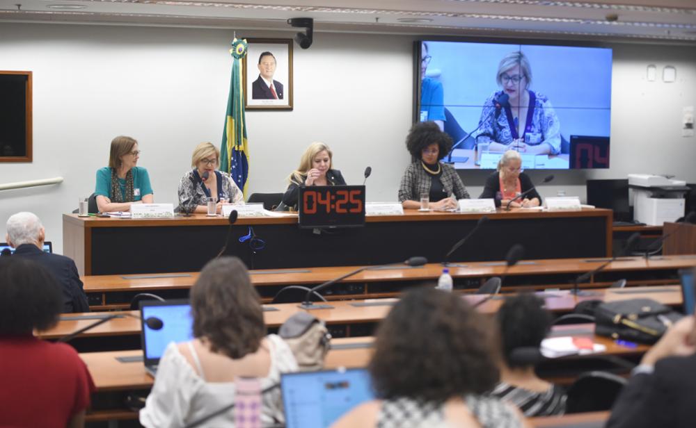 Mesa teve a participação da secretária da Política Nacional de Cuidados e Família, Lais Abramo, da secretária Nacional de Autonomia Econômica e Políticas de Cuidado, Rosane Silva, da deputada Luizianne Lins e da escritora Raquel Santana (Foto: Leonardo Prado/Câmara dos Deputados)