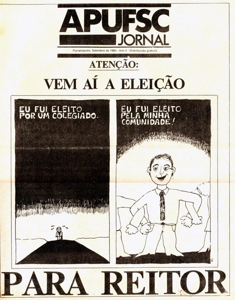 “Em 1983, a UFSC iniciava o processo de escolha do novo reitor. Reivindicação dos movimentos estudantis e de servidores, a consulta democrática para escolher o reitor começou com a votação da comunidade universitária, nos dias 10 e 11 de novembro daquele ano. Em abril de 1984, o Jornal Universitário abordava a nomeação do novo reitor, enquanto a UFSC aguardava que o presidente da República referendasse a escolha da comunidade universitária. ‘Houve uma participação maciça. Foi uma eleição igual a qualquer outra, precedida de campanhas, comícios e promessas. A exceção: foi limpa e transcorreu em alto nível’, diz a edição do jornal. Os mais votados, pela ordem, foram: Rodolfo Pinto da Luz, Oswaldo de Oliveira Maciel, Alvaro Reinaldo de Souza, Alzira Hessmann Dutra, Arno Bollmann e Ana Maria Beck. O processo de escolha foi paritário, com peso de um terço para cada categoria (docente, técnico e discente)”.