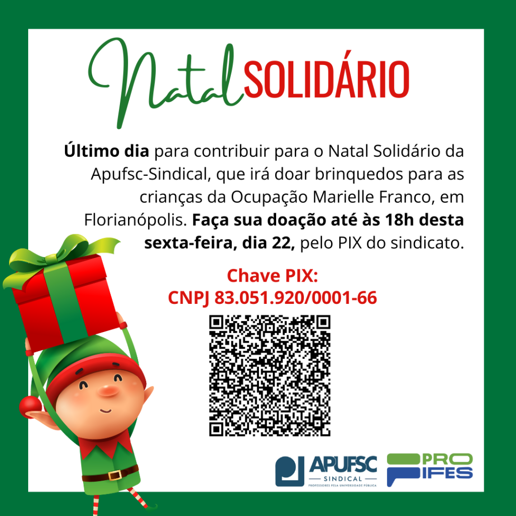 A Apufsc-Sindical comunica que ainda dá tempo de contribuir com a Ação Solidária de Natal. Os fundos recebidos serão destinados à compra de brinquedos para as crianças da Ocupação Marielle Franco, em Florianópolis, entregues no almoço de Natal, do dia 25. As doações devem ser feitas até às 18h desta sexta-feira, dia 22, pelo PIX da Apufsc-Sindical (CNPJ 83.051.920/0001-66).