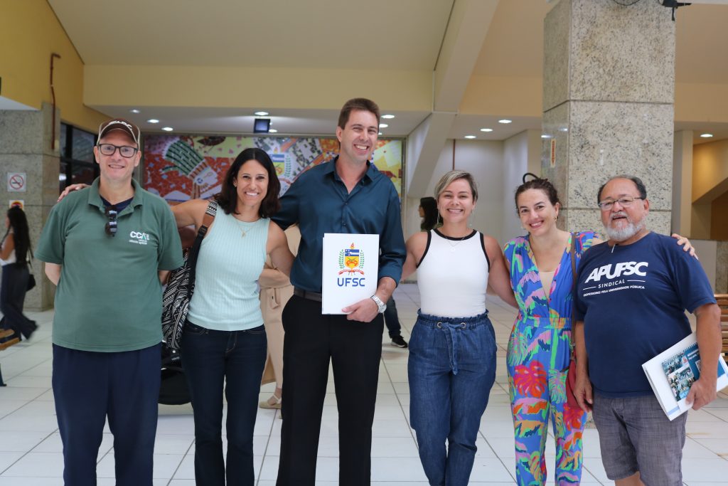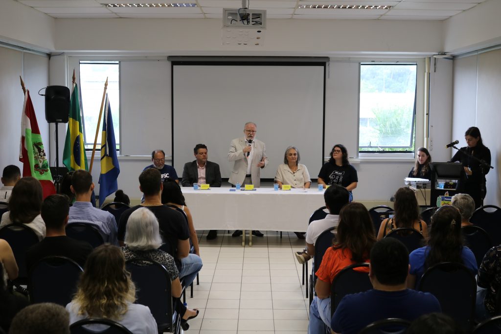 A mesa cerimonial foi composta pelo reitor da UFSC, Irineu Manoel de Souza, a pró-reitora de Desenvolvimento e Gestão de Pessoas (Prodegesp), Sandra Regina Carrieri de Souza, o diretor do Departamento Ensino da Pró-Reitoria de Graduação (Prograd), Antonio Alberto Brunetta, o presidente da Apufsc-Sindical, José Guadalupe Fletes, e a representante do Sintufsc, Marjori Machado. Também estiveram presentes no evento a secretária-geral da Apufsc, Viviane Maria Heberle, a diretoria financeira, Karine Simoni, além de representantes dos centros de ensino.