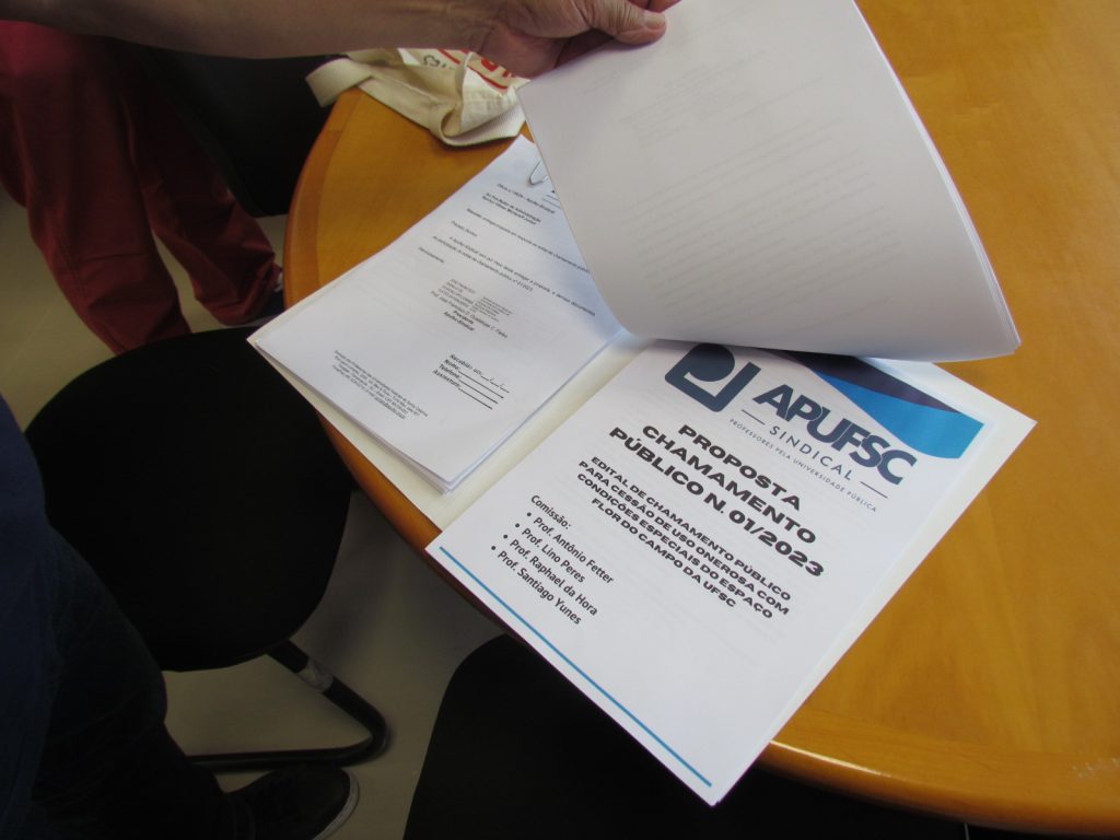 A proposta da Apufsc foi elaborada por uma comissão formada pelos professores Antônio Fetter, Lino Peres, Raphael da Hora e Santiago Yunes. O projeto foi entregue presencialmente à Proad pelo presidente da Apufsc, José Guadalupe Fletes, com a presença da secretária-geral, Vivivane Heberle, do diretor de Divulgação e Imprensa, Márcio Vieira de Souza, e pelos membros da Comissão, Santiago Yunes, que também é diretor Financeiro Adjunto do sindicato, e de Raphael da Hora. O administrador da Apufsc, Henrique Machado, também participou.