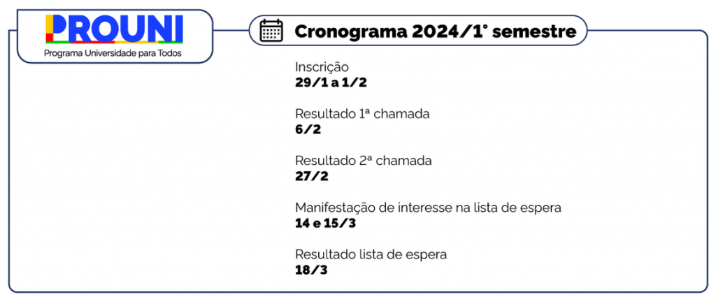 O processo seletivo do Prouni 2024/1 é constituído por duas chamadas sucessivas. A segunda ocorrerá no dia 27 de fevereiro.