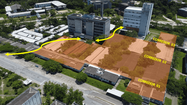 A Coordenadoria de Planejamento do Espaço Físico do Departamento de Projetos de Arquitetura e Engenharia da Universidade Federal de Santa Catarina (UFSC) irá interditar espaços e alterar o acesso e circulação da região dos blocos modulados, localizada no campus Trindade, em Florianópolis. A área fica no entorno da sede da Apufsc-Sindical no campus. Os corredores 1 e 3 destacados na imagem já estão fechados. Desde segunda-feira, dia 4, o corredor 2 também está interditado.
