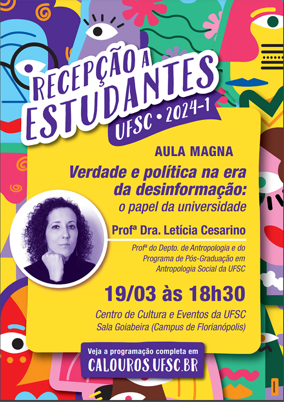 A Aula Magna do início do semestre tem como título Verdade e Política na era da desinformação: o papel da universidade. A ministrante será a professora Letícia Cesarino, do Departamento de Antropologia da UFSC, que também é assessora especial em Educação e Cultura em Direitos Humanos no Ministério dos Direitos Humanos e da Cidadania e afiliada do International Panel on the Information Environment.