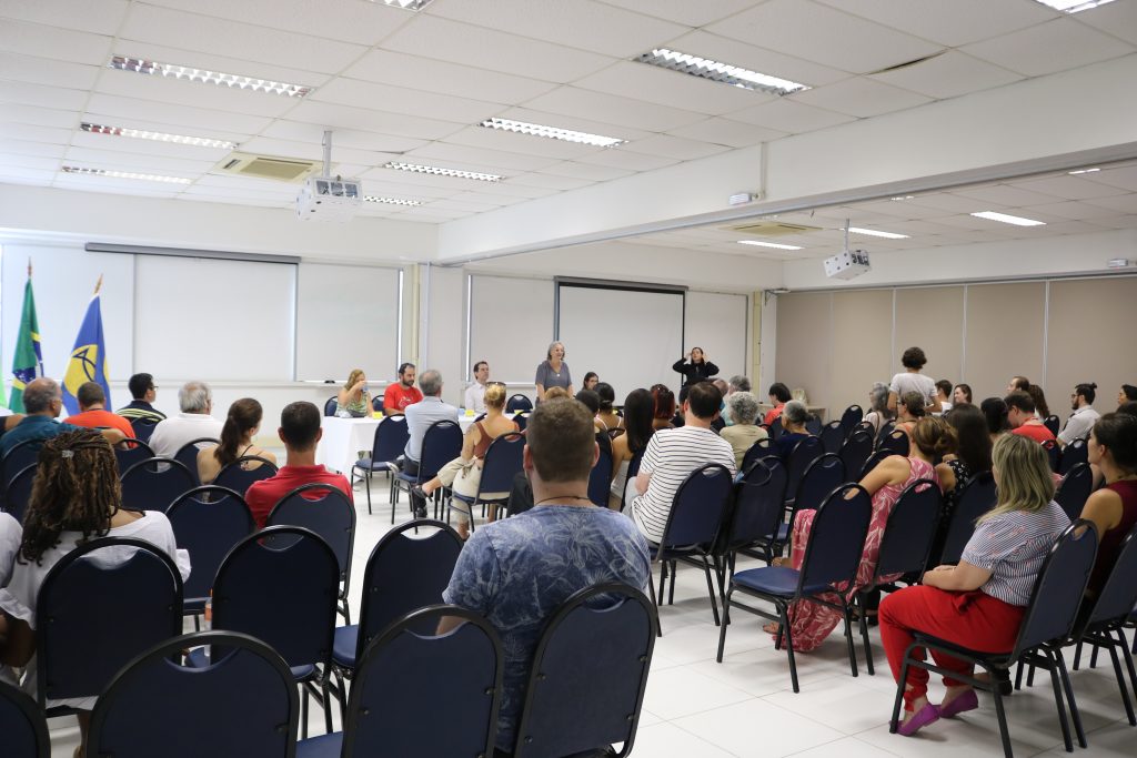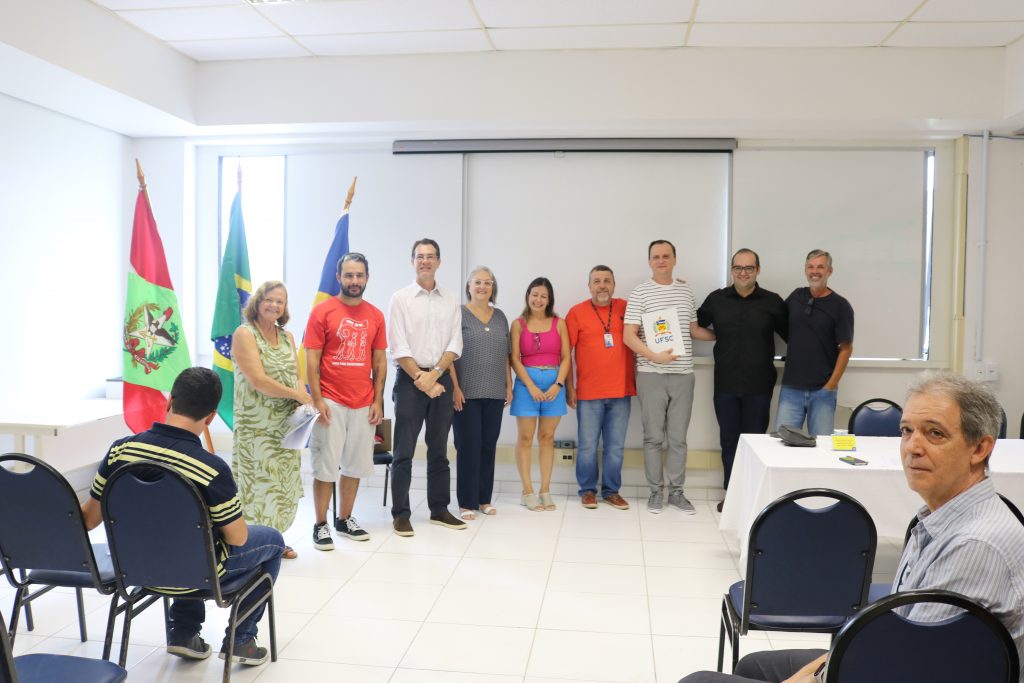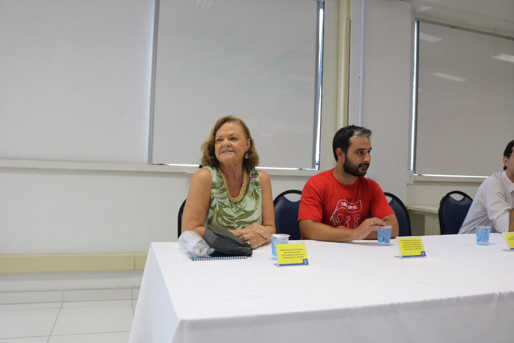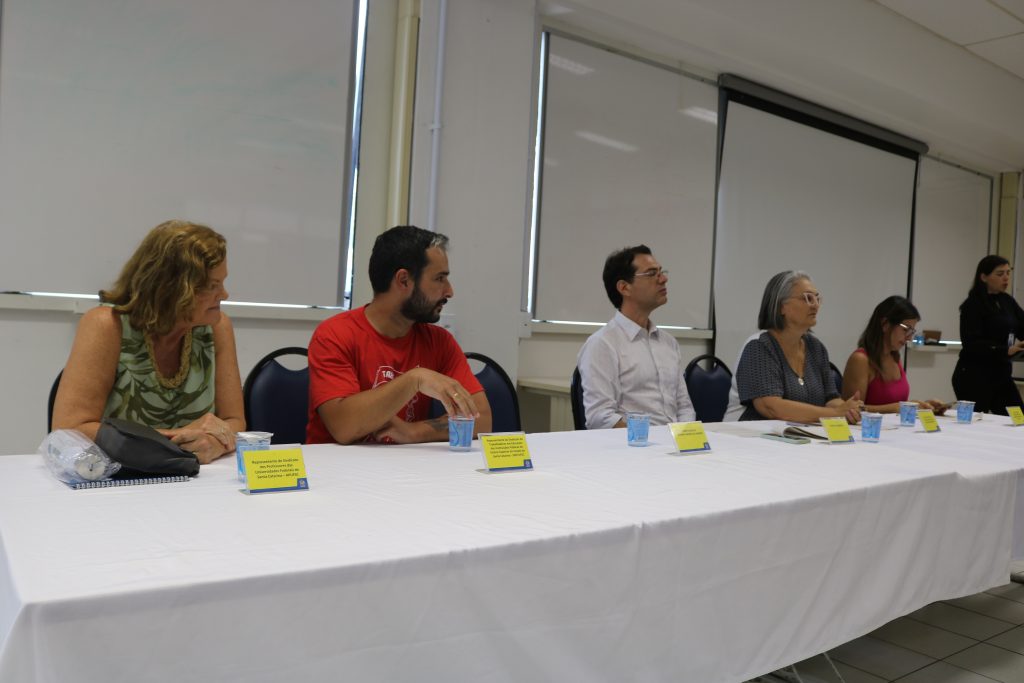 Além da representante da Apufsc-Sindical, compuseram a mesa o chefe de gabinete da Reitoria, Bernardo Meyer, a pró-reitora de Desenvolvimento e Gestão de Pessoas (Prodegesp), Sandra Regina Carrieri de Souza, a diretora do Departamento de Desenvolvimento de Pessoas (DDP) da Prodegesp, Carla Cerdote da Silva, e o membro da diretoria do Sintufsc, Eduardo de Mello Garcia.
