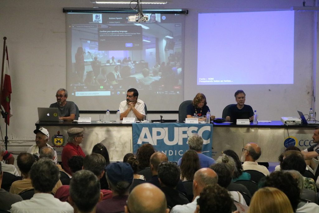 A Assembleia Geral Extraordinária (AGE) realizada pela Apufsc-Sindical na tarde desta quarta-feira, dia 27, durou mais de três horas e resultou em cinco encaminhamentos, votados pela categoria docente: