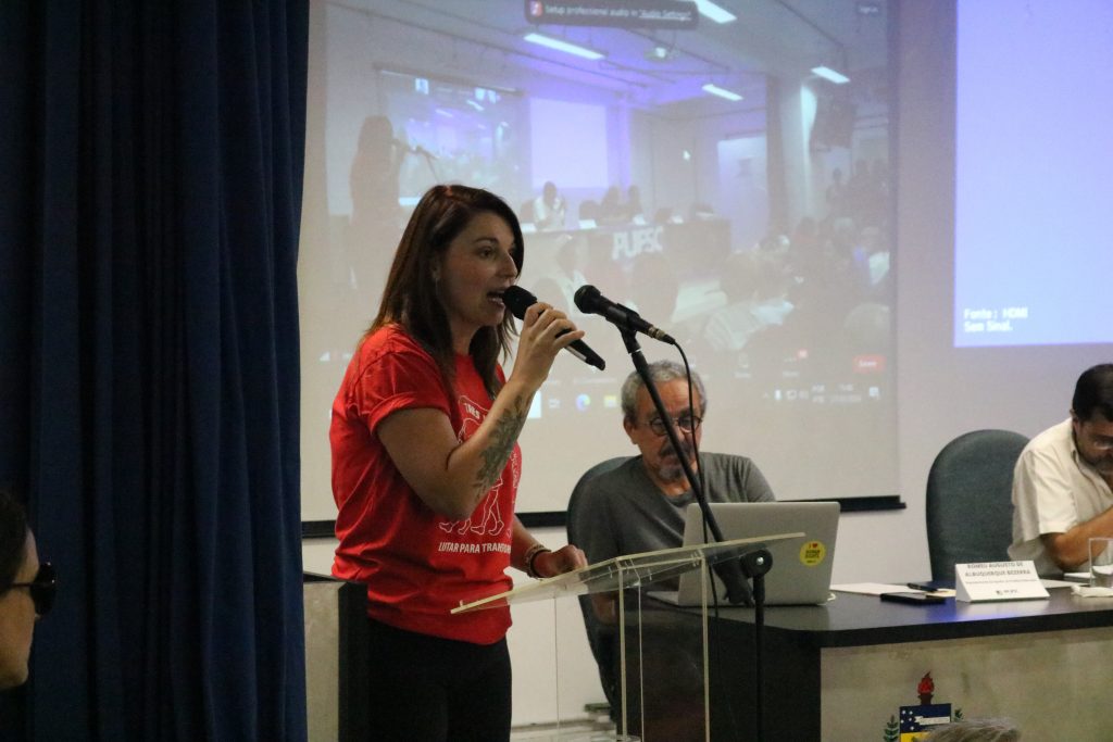 Depois da explanação, foi aberto momento para as falas de participantes. No total, 20 pessoas falaram, sendo a maioria favorável à construção de um movimento de greve. As professoras e professores ressaltaram que a AGE foi reivindicação do Conselho de Representantes (CR) da Apufsc e fizeram sugestões de encaminhamentos, que foram votadas na sequência.