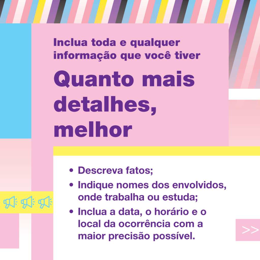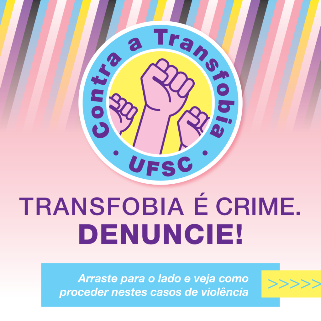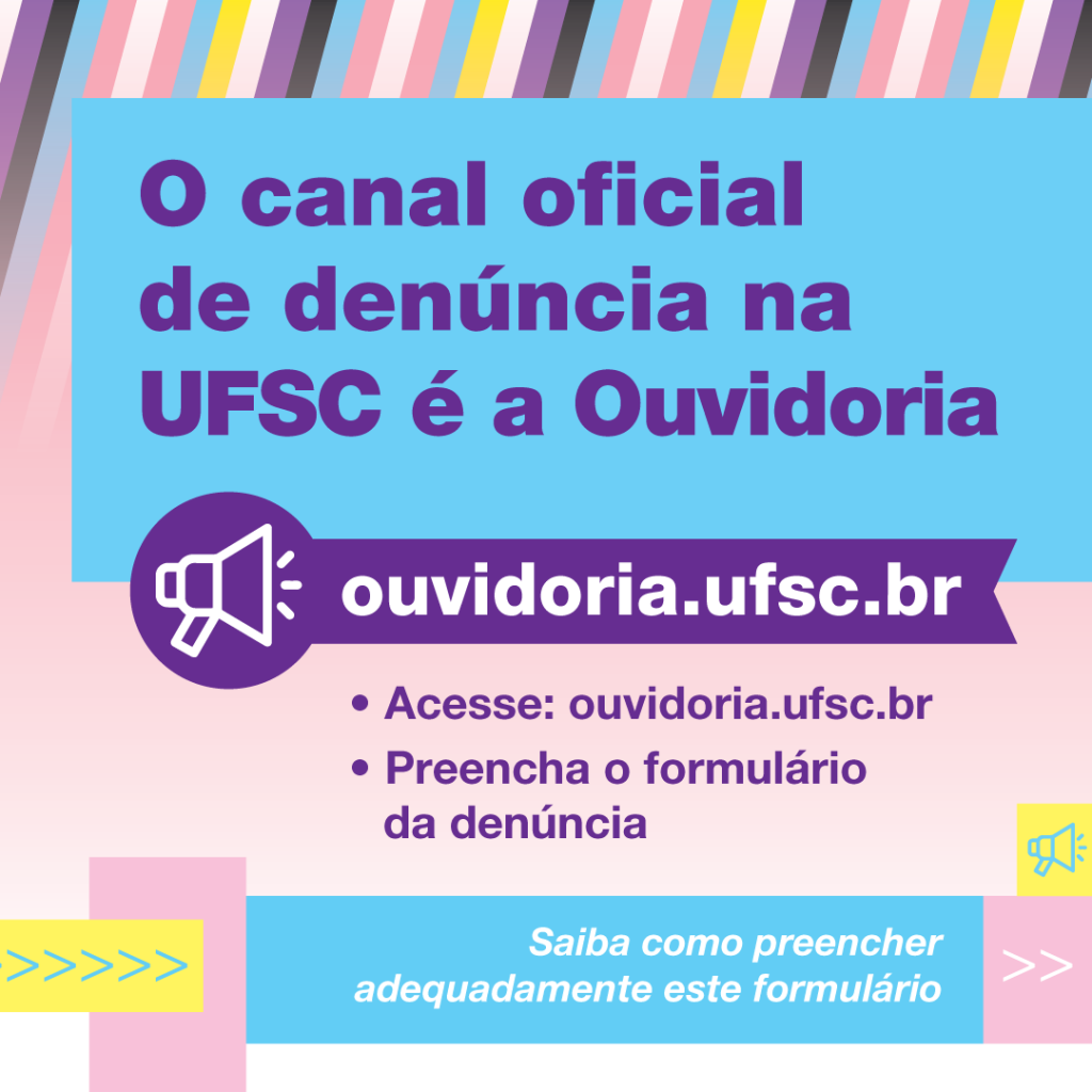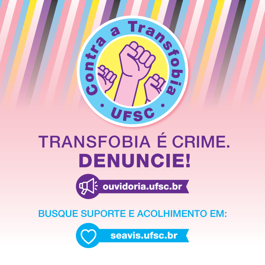 A Universidade Federal de Santa Catarina (UFSC) divulgou neste domingo, dia 31, Dia Internacional da Visibilidade Transgênero, orientações sobre o fluxo de denúncia para caso de violência ou agressão contra pessoas travestis, transexuais e transgêneros. O material, desenvolvido pela Coordenadoria de Design e Programação Visual da Agência de Comunicação (CDPV/Agecom/SECOM), em conjunto com a Coordenadoria de Diversidade Sexual e Enfrentamento de Violência de Gênero (CDGEN) da Pró-Reitoria de Ações Afirmativas e Equidade (Proafe), explica que o canal oficial para denúncias é a Ouvidoria da UFSC, através de um formulário que pode ser acessado neste link: https://ouvidoria.ufsc.br/.