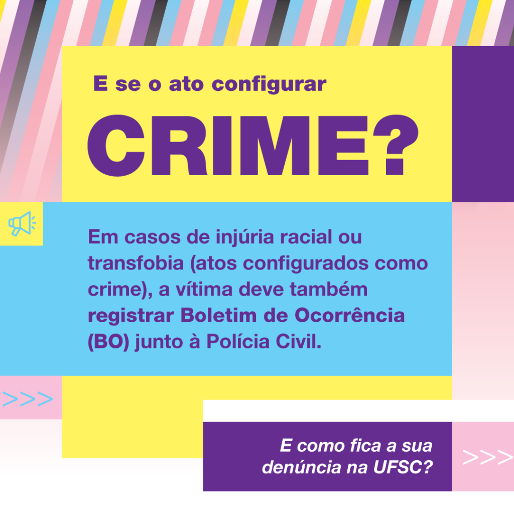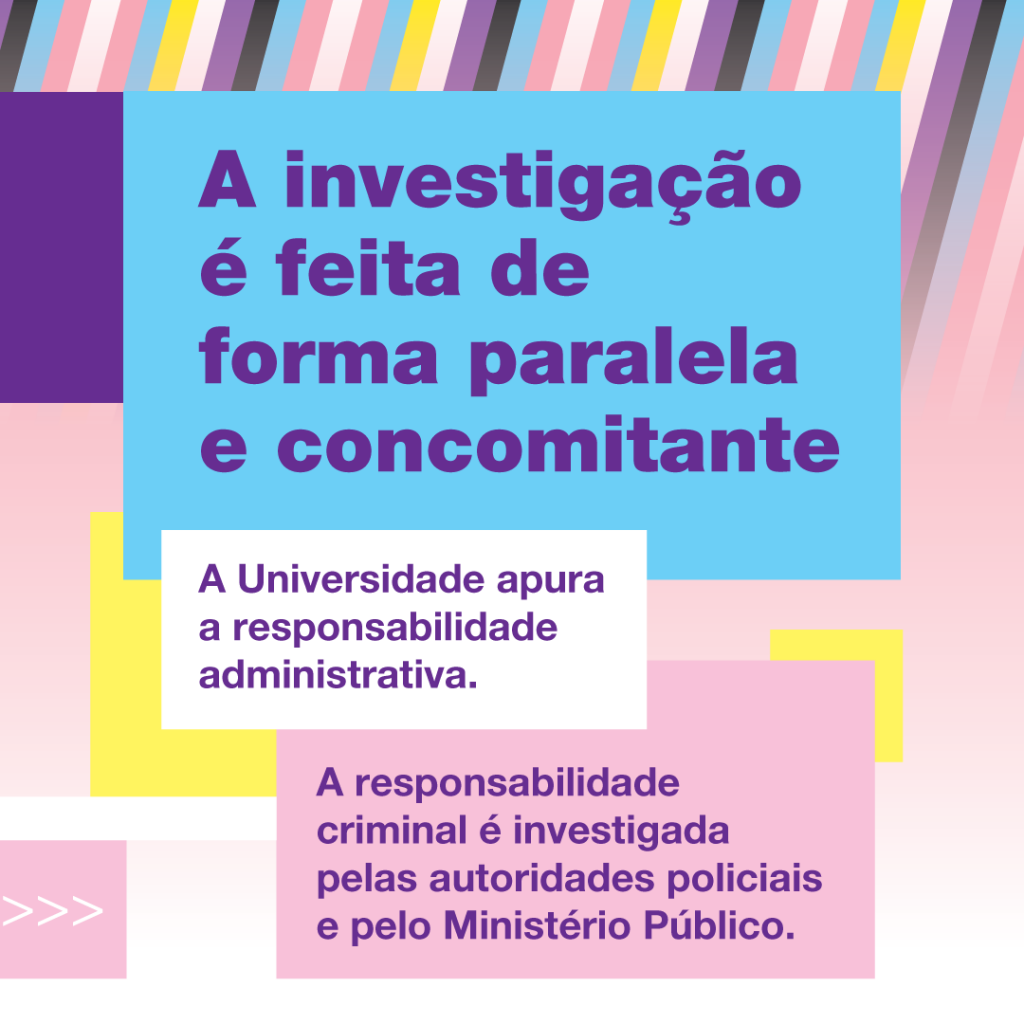 No caso de injúria racial ou transfobia, a vítima também deve registrar um boletim de ocorrência junto à Polícia Civil. A investigação é feita de forma paralela e concomitante. A Universidade apura a responsabilidade administrativa, enquanto a responsabilidade criminal é investigada pelas autoridades policiais e pelo ministério público.