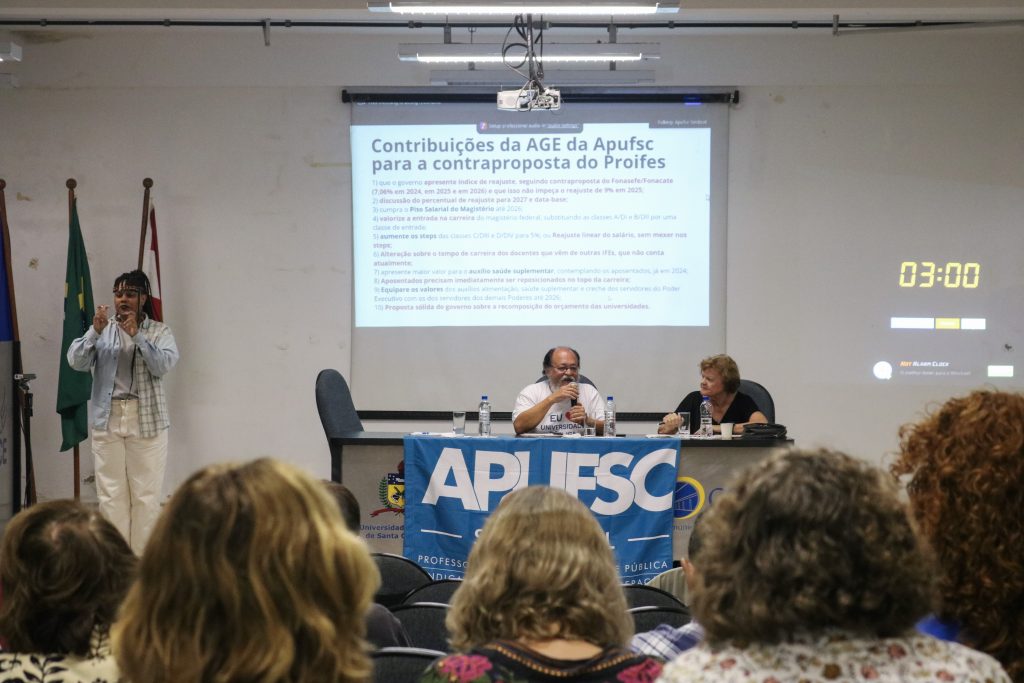 A Apufsc-Sindical realizou Assembleia Geral Extraordinária (AGE) na manhã desta segunda-feira, dia 29, no auditório do Centro de Comunicação e Expressão (CCE) da Universidade Federal de Santa Catarina (UFSC), para discutir os encaminhamentos a serem levados ao Proifes-Federação para elaboração da contraproposta ao governo federal em relação ao reajuste salarial e carreira docente. Essa foi uma das decisões da reunião do Conselho de Representantes realizada na quarta-feira, dia 24.
