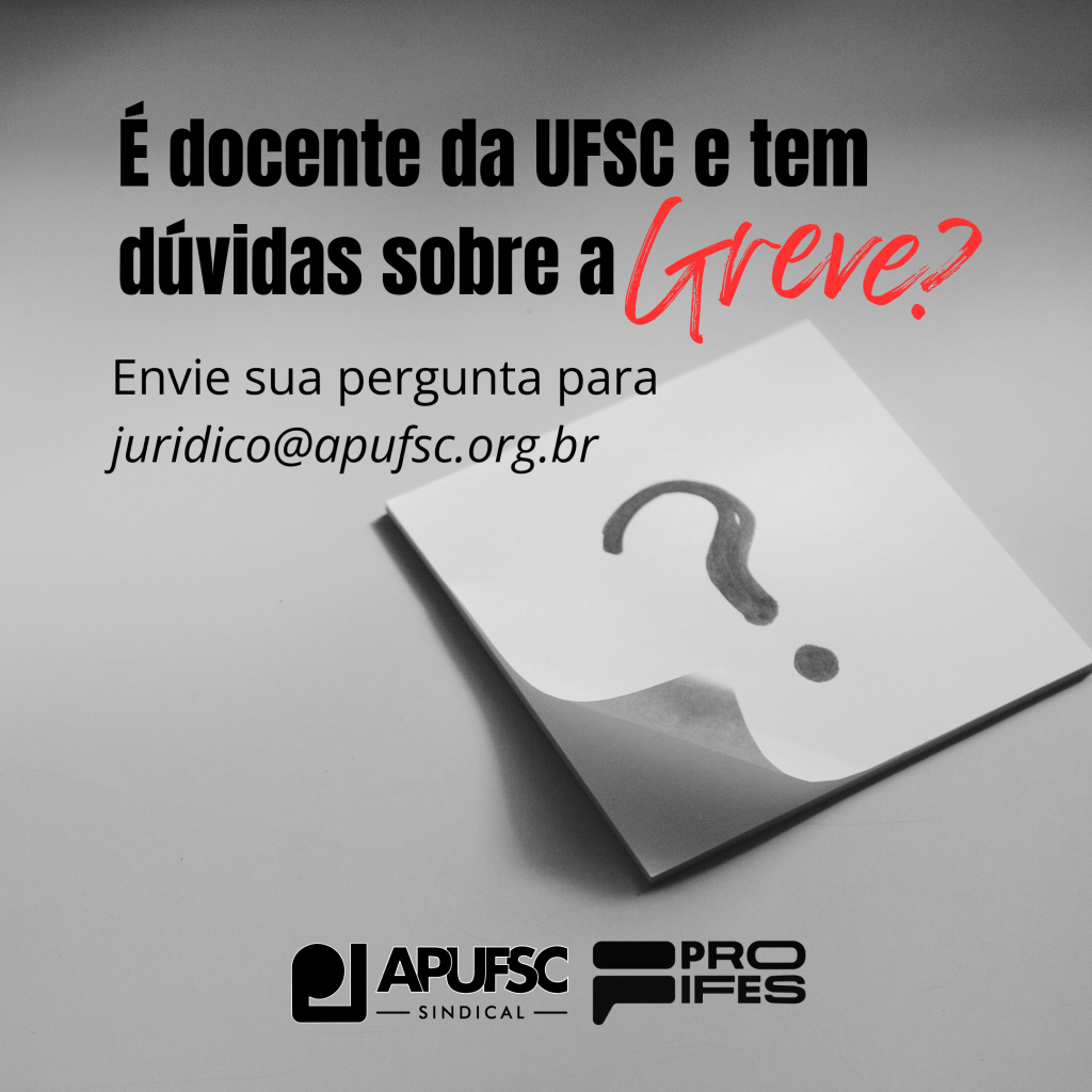 A categoria docente da Universidade Federal de Santa Catarina (UFSC) está em greve desde esta terça-feira, dia 7. Há 12 anos não havia paralisação de professores e professoras na universidade. Assim, é comum que muitas dúvidas surjam sobre o assunto. A Comunicação do sindicato já preparou um conteúdo com perguntas e respostas sobre a greve, mas muitas professores e professoras ainda têm questionamentos sobre pontos específicos. Por isso, o setor Jurídico está coletando questionamentos, que serão respondidos pelos advogados do sindicato. Envie sua pergunta para o e-mail [email protected].