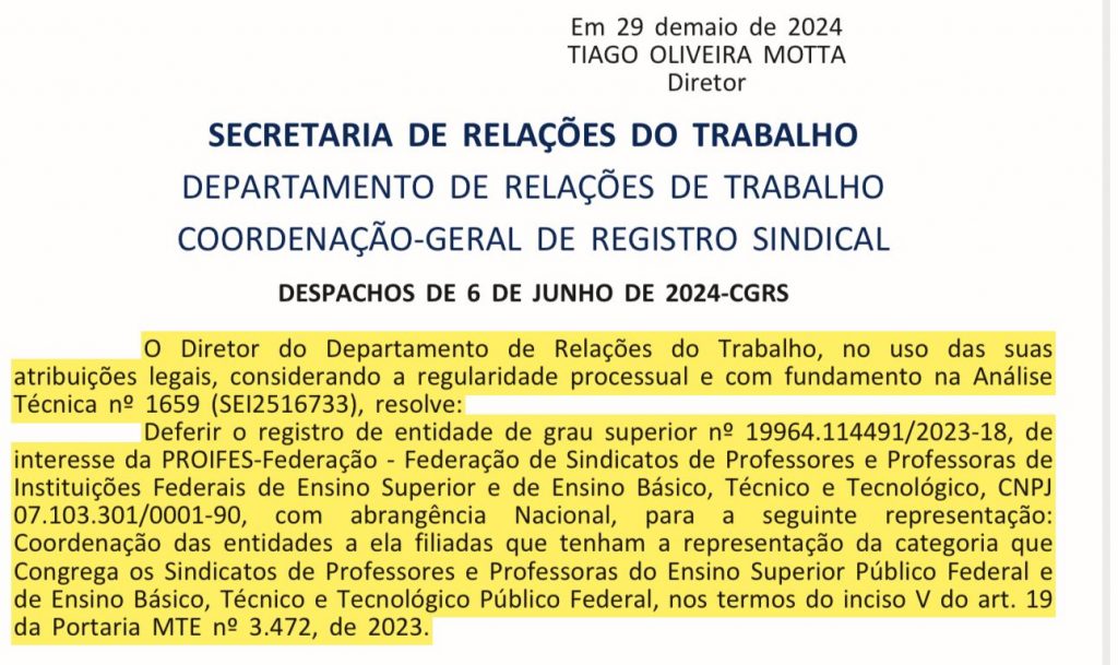 “Com essa publicação, todas as argumentações da Andes com relação à tentativa de usurpar a representatividade da nossa federação caem por terra, porque a base principal do seu argumento era a inexistência de carta sindical”.
