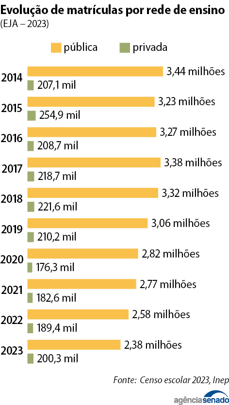 Da mesma forma, em 2014 foram 3,65 milhões de matrículas, enquanto no ano passado os matriculados na EJA eram 2,58 milhões, uma diferença a menor de 29,11%.