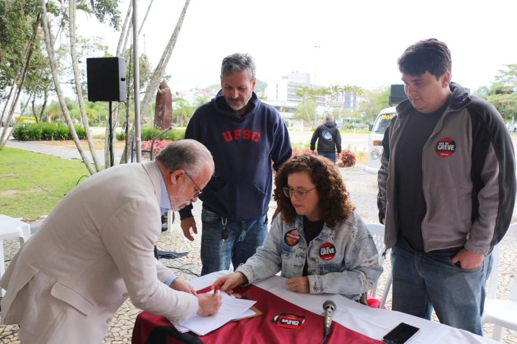 Os servidores técnico-administrativos em educação (TAEs) da Universidade Federal de Santa Catarina (UFSC) assinaram o termo de acordo com a Reitoria na sexta-feira, dia 5, oficializando o encerramento da greve iniciada em março. O documento prevê o retorno às atividades nesta segunda-feira, dia 8, além de outras medidas que deverão ser implementadas pela gestão em conjunto com os trabalhadores, a partir de comissões, para atendimento à pauta local de reinvindicações do movimento.