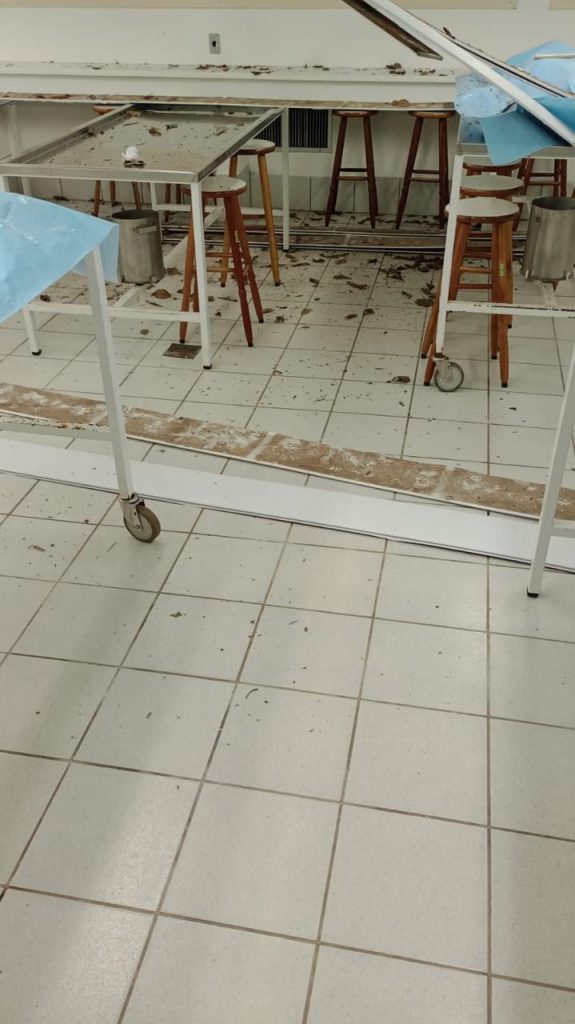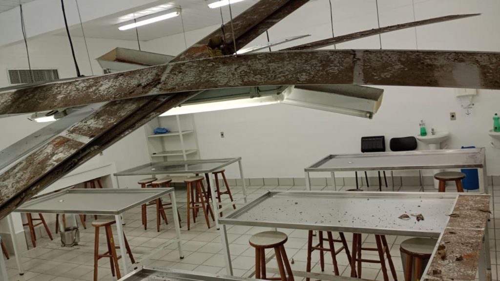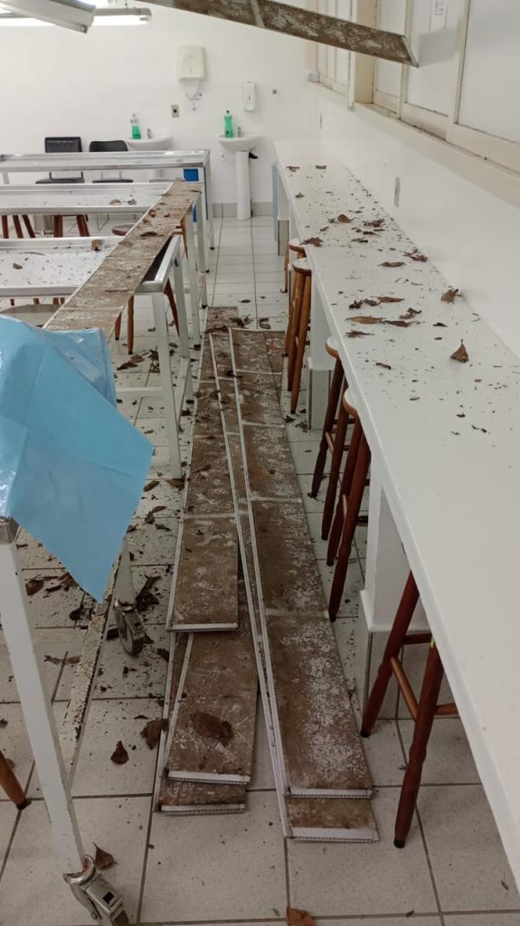 O forro do laboratório anatômico do Departamento de Ciências Morfológicas do Centro de Ciências Biológicas (CCB) da Universidade Federal de Santa Catarina (UFSC), campus Florianópolis, desabou nesta terça-feira, dia 9. Segundo o departamento, a situação do local, que já era complicada, vem se deteriorando nos últimos dias e, com as chuvas dessa semana, aliada à falta de manutenção, a estrutura desabou.