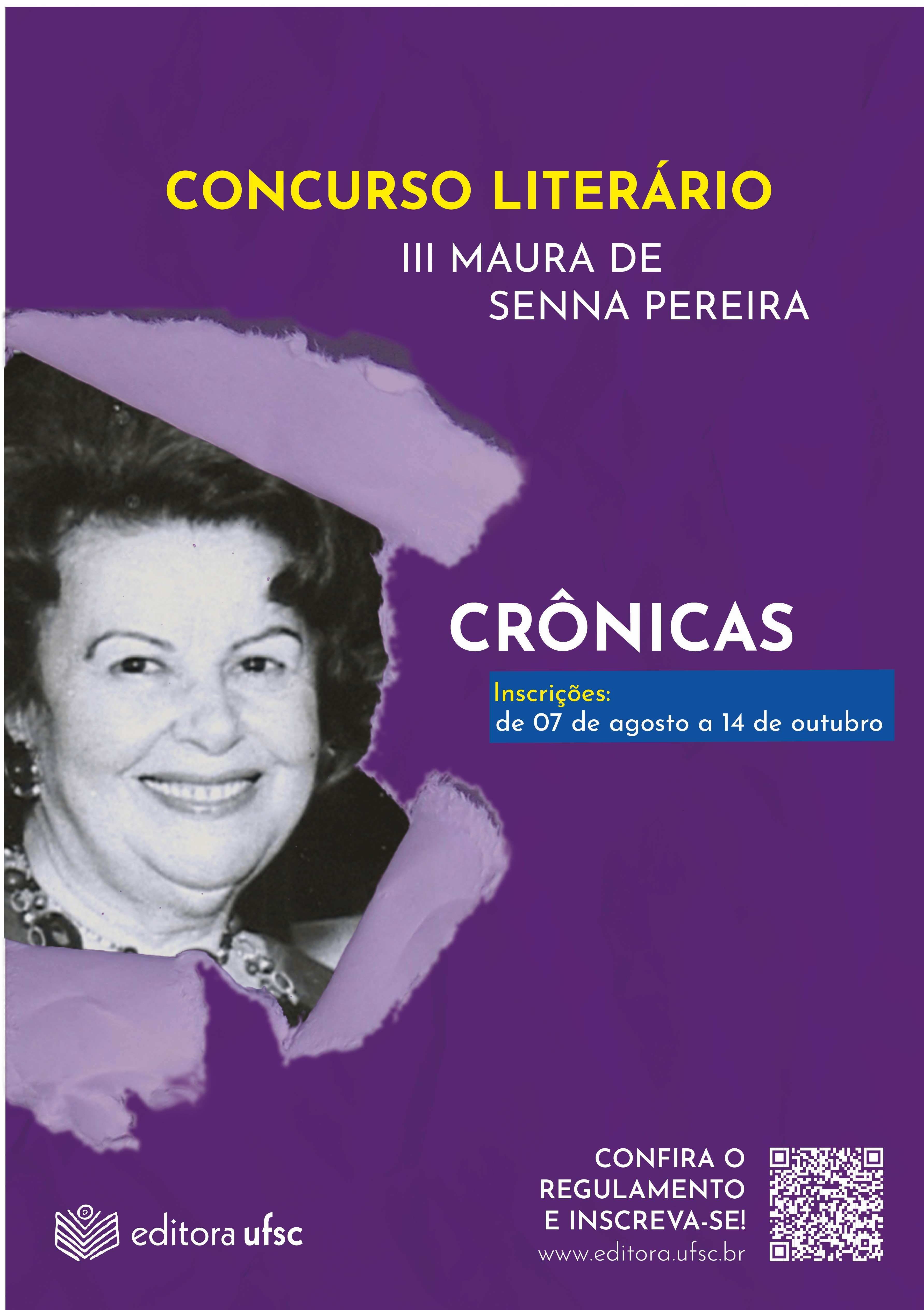 Estão abertas as inscrições para participar do concurso literário III Maura de Senna Pereira, promovido pela Editora da Universidade Federal de Santa Catarina (EdUFSC), que premiará o vencedor com a publicação de um livro de crônicas. As inscrições devem ser realizadas até o dia 14 de outubro pelo site da EdUFSC. Para participar, o candidato deve ser natural de Santa Catarina ou residente do estado há pelo menos dois anos.