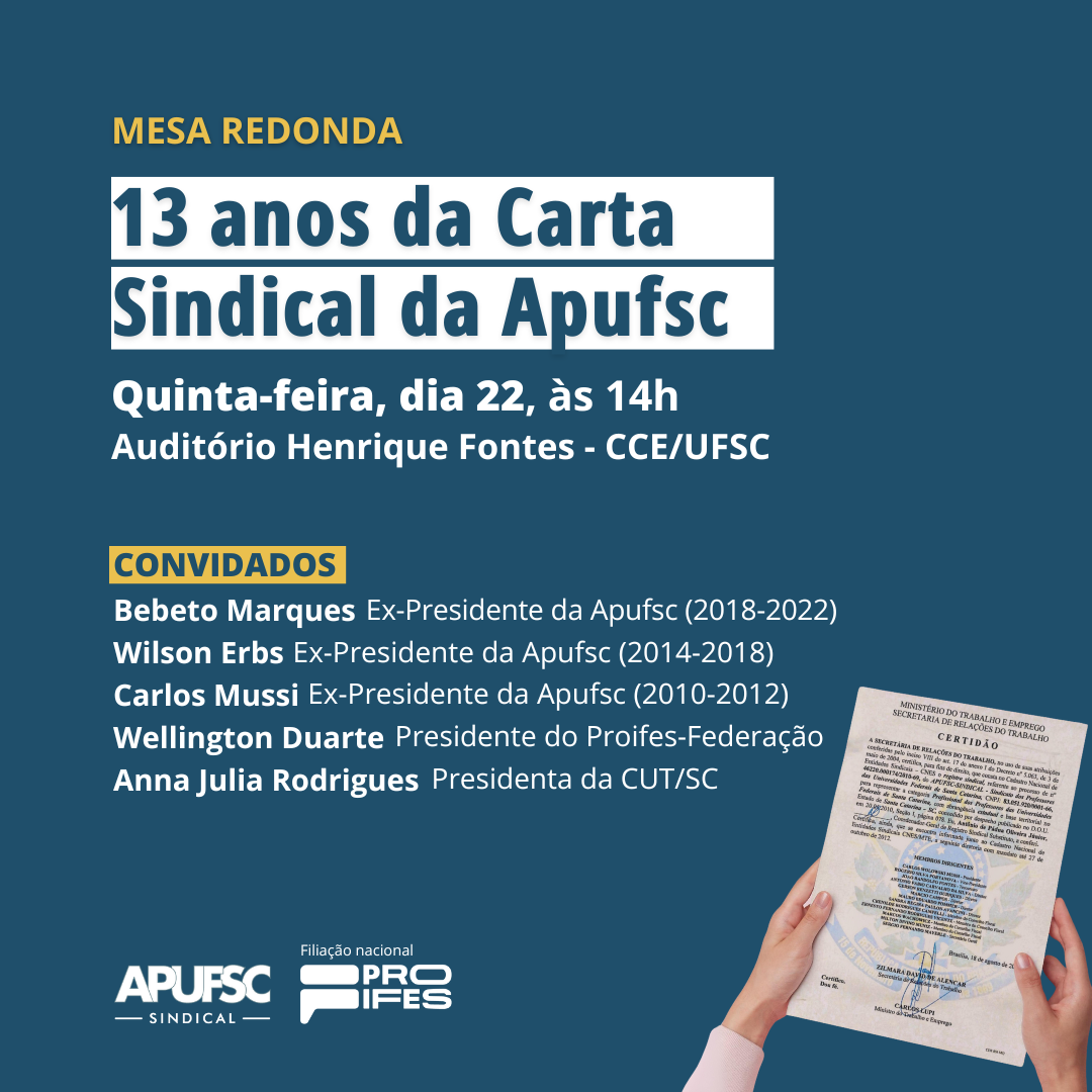 A mesa redonda vai reunir os ex-presidentes da Apufsc Carlos Mussi (2010-2012), Wilson Erbs (2014-2018), Carlos Alberto Marques (2018-2022), o presidente do Proifes-Federação, Wellington Duarte, e a presidenta da Central Única dos Trabalhadores em Santa Catarina (CUT/SC), Anna Julia Rodrigues.