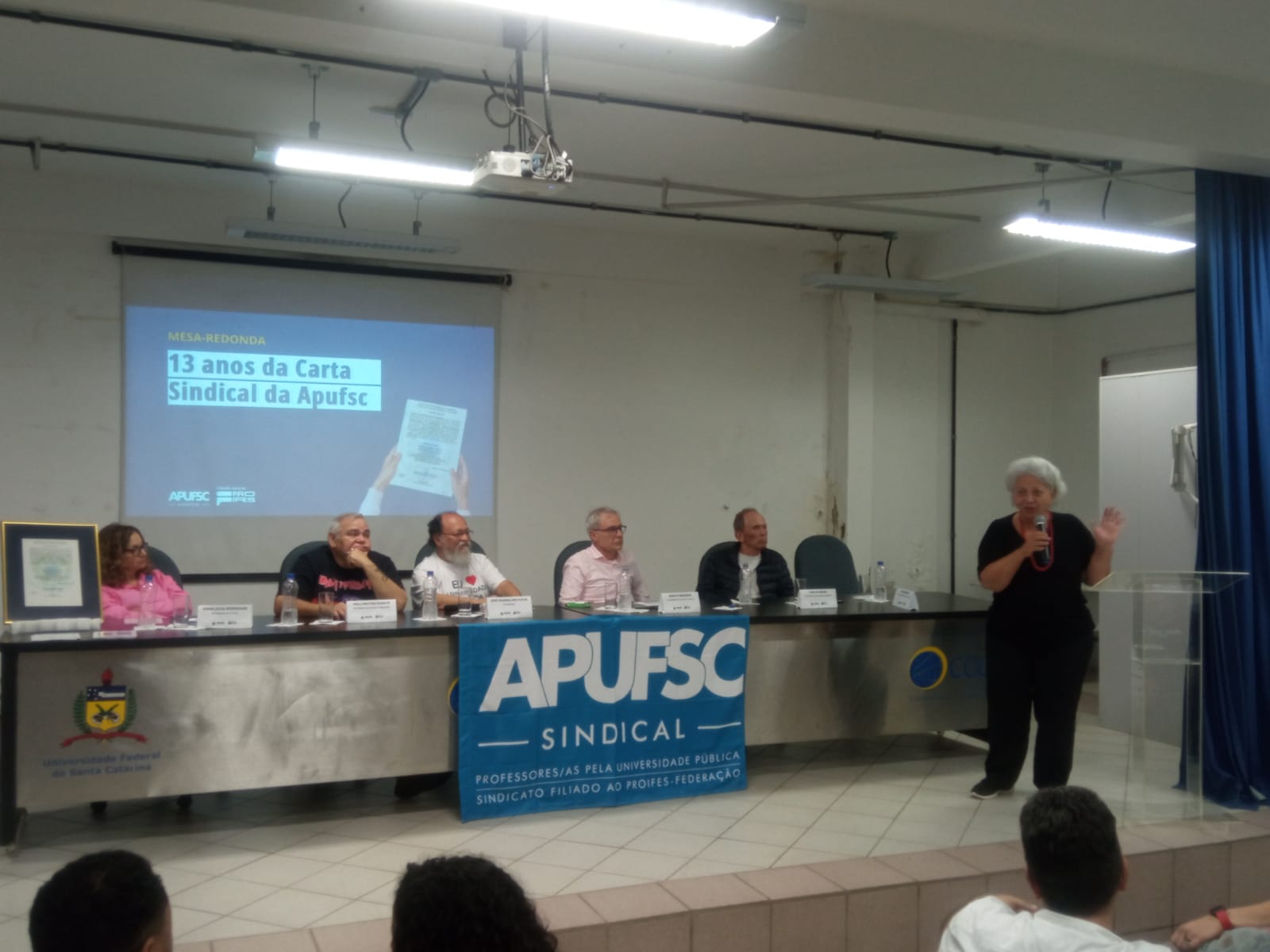 A mesa redonda foi conduzida pelo presidente da Apufsc, José Guadalupe Fletes. Na abertura, ele agradeceu aos presentes e passou a palavra ao vice-presidente, Adriano Duarte, que leu uma nota em nome da Diretoria. Nela, a gestão defendeu que o evento “é um ato político em defesa da carta sindical”, e a mesa foi composta por pessoas que continuam atuando em prol do documento. “Hoje celebramos aqui a autonomia sindical, a democracia sindical e o diálogo”, finalizou Adriano.