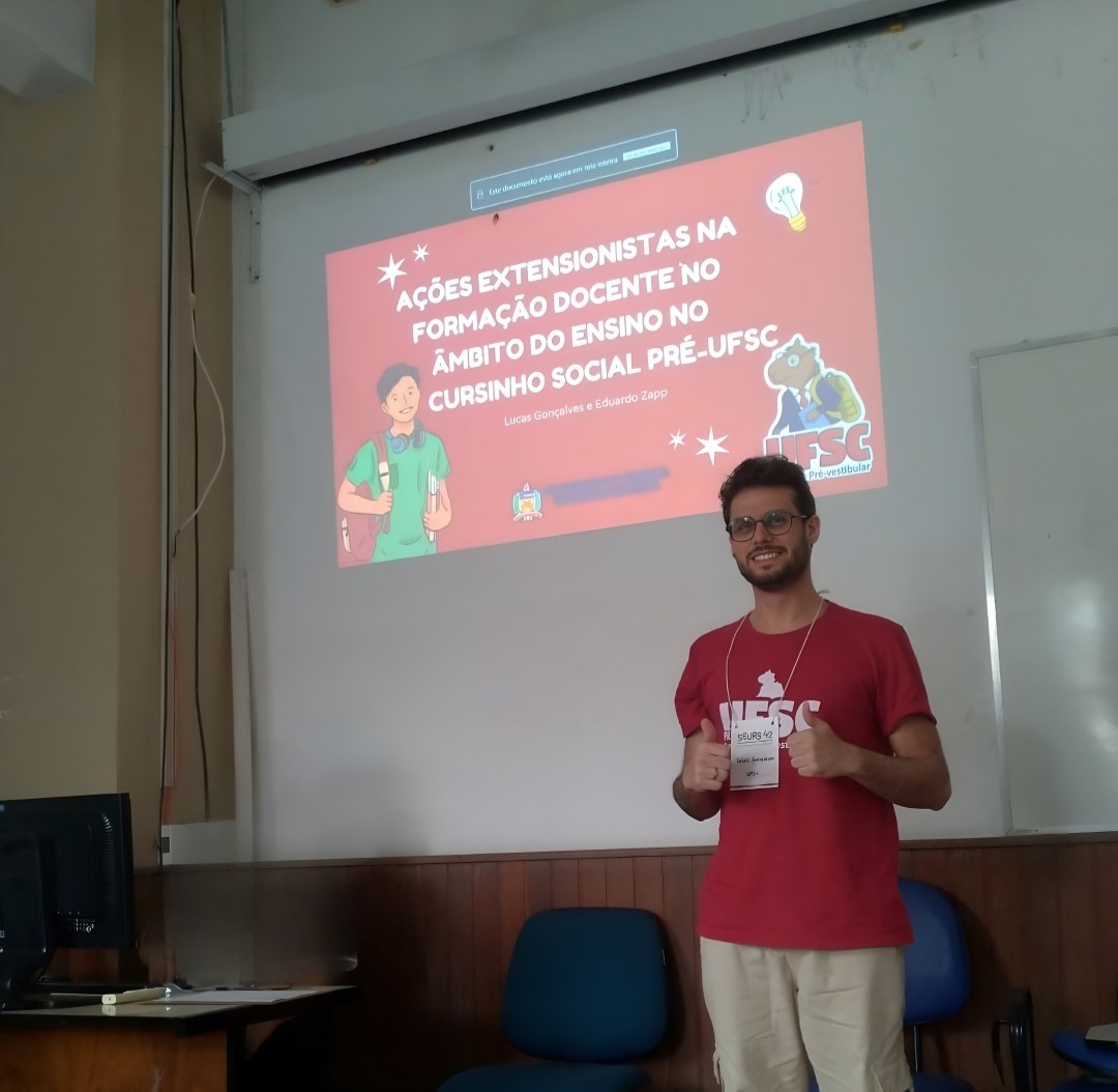 O Pré-UFSC foi apresentado por Lucas no formato tertúlia (apresentação oral com roda de conversa). “As apresentações são com tempo limitado, porém o grande debate após a minha fala foi de enriquecimento para os demais trabalhos apresentados. Sendo o único apresentador de um curso de Licenciatura e com experiência em sala de aula, pude dividir relatos dos desafios do novo ensino médio e da discrepância no ensino público e privado com base nas minhas vivências”, relata Lucas.