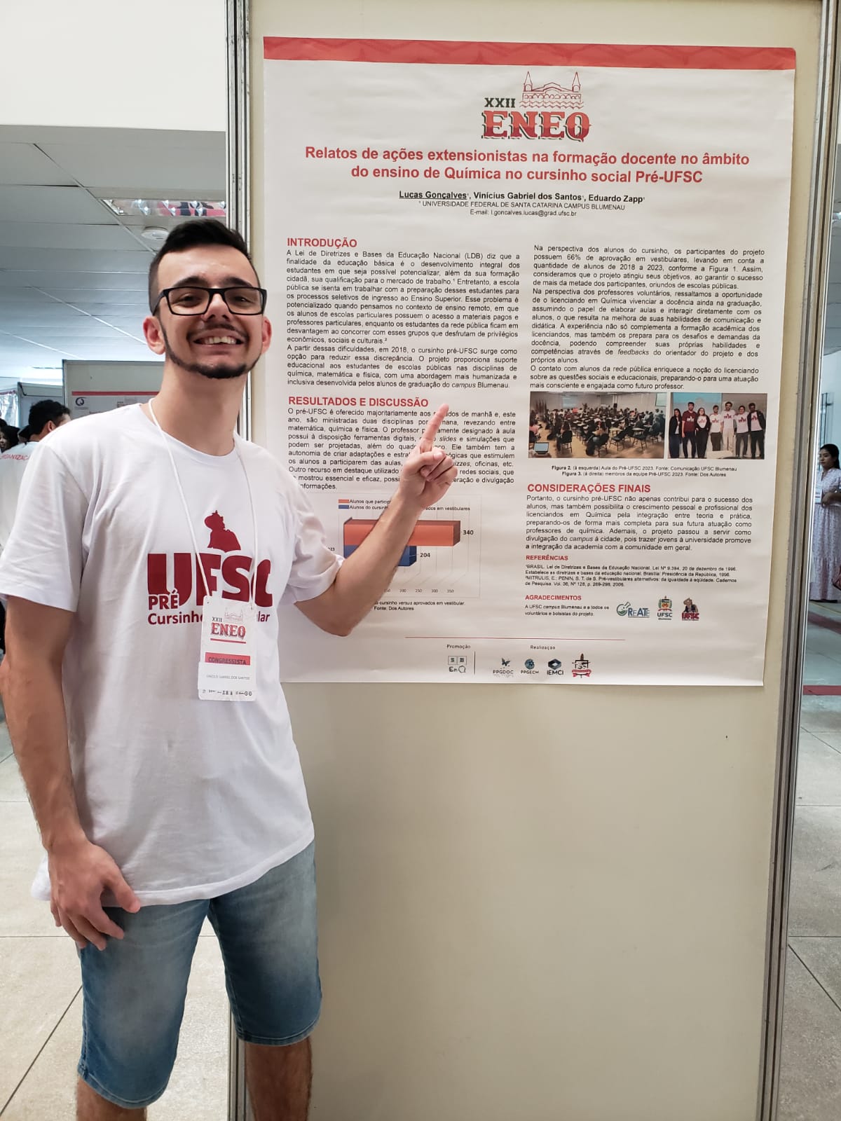 O Pré-UFSC, cursinho pré-vestibular gratuito da UFSC Blumenau voltado para estudantes de escolas públicas, foi apresentado na semana passada em dois eventos nacionais: o Encontro Nacional de Ensino de Química (Eneq) e o Seminário de Extensão Universitária da Região Sul (Seurs). O projeto de extensão foi representado pelos estudantes do curso de Licenciatura em Química e voluntários do cursinho Lucas Gonçalves e Vinícius Gabriel dos Santos.