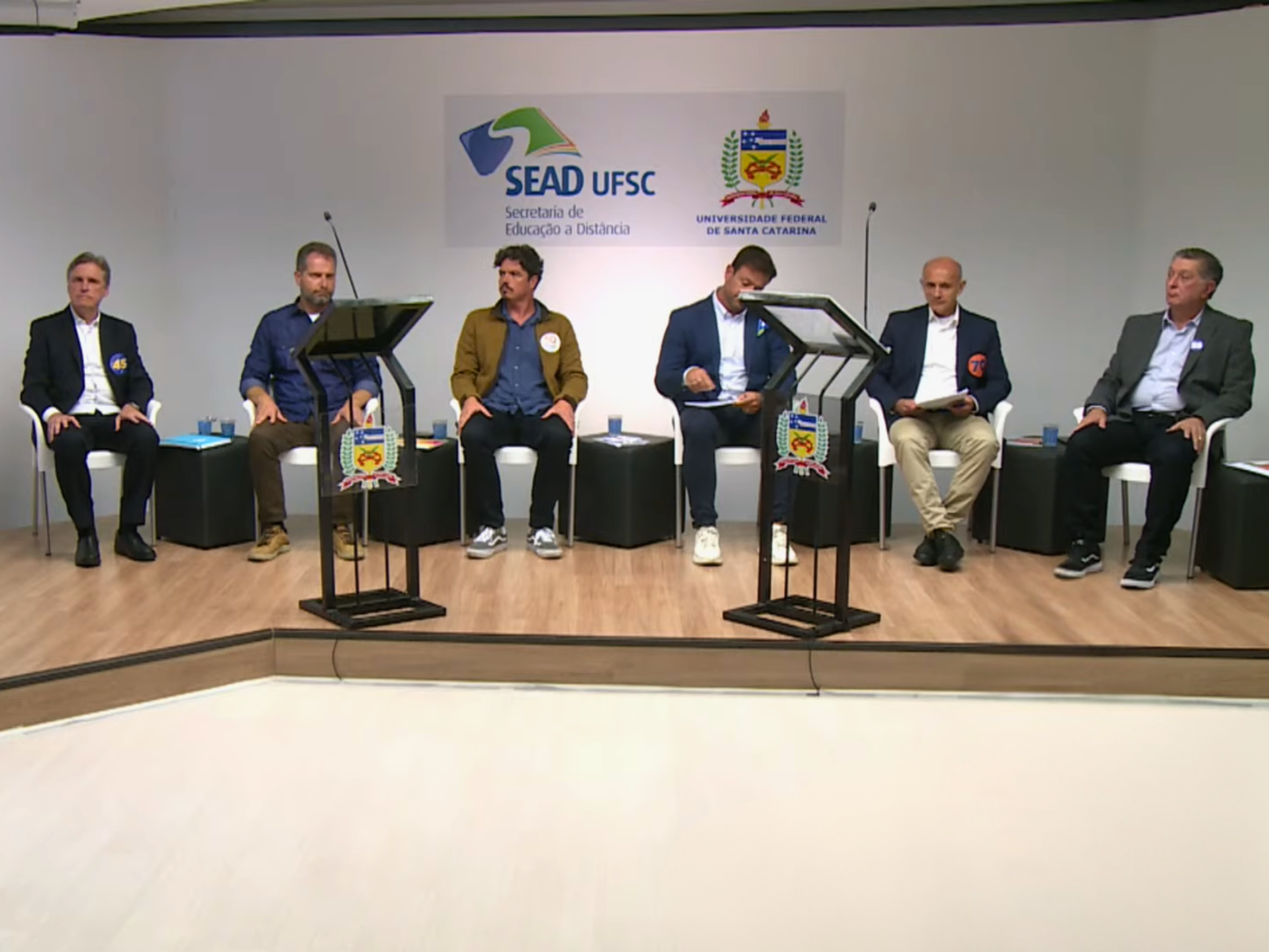 Aconteceu na noite desta sexta-feira, dia 20, o debate entre os candidatos à prefeitura de Florianópolis (SC), promovido pela Universidade Federal de Santa Catarina (UFSC) e pela Apufsc-Sindical, com o apoio do Centro Acadêmico XI de Fevereiro (Caxif). O reitor da universidade, Irineu Manoel de Souza, o presidente da Apufsc, José Guadalupe Fletes, e o vice-presidente do Caxif, Pedro Bertoli, estiveram presentes no estúdio da Secretaria de Educação a Distância (SEAD), de onde o evento foi transmitido pela TV UFSC.