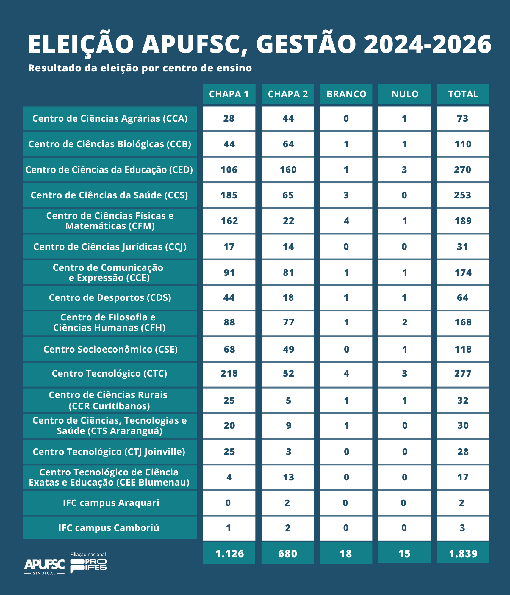 A votação para a eleição da nova Diretoria do sindicato encerrou na sexta-feira, dia 11, com a vitória da Chapa 01, “Somos Apufsc”, presidida por Carlos Alberto Marques, que obteve 1.126 votos (61,23%). A Chapa 02, “Mobiliza Apufsc: base, democracia e luta”, presidida por Adriana D’Agostini, recebeu 680 votos (36,98%). Ao todo, 1.839 filiados e filiadas participaram da votação, por meio da plataforma apufsc.elejaonline.com.