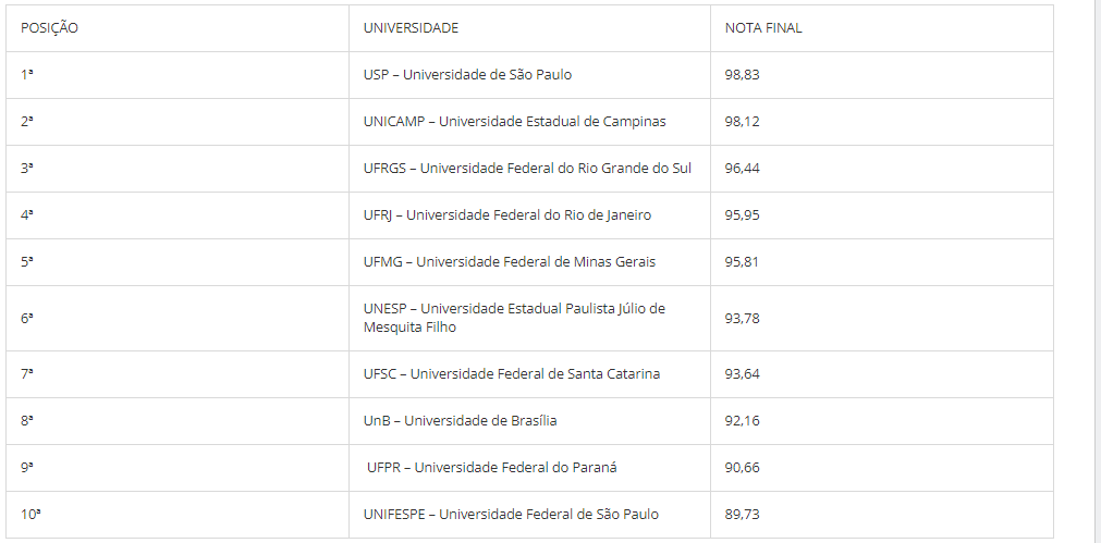 Na listagem geral, que considera ainda as instituições estaduais e privadas, a UFSC figura na sétima colocação (ver tabela abaixo). Na edição deste ano, se mantêm no topo do ranking a Universidade de São Paulo (USP) e a Universidade Estadual de Campinas (Unicamp). Entre as dez melhores instituições brasileiras, a maioria continua localizada no Sudeste e no Sul do país. Fora dessas regiões, a primeira a se destacar é a Universidade de Brasília (UnB), em oitavo lugar, e a Universidade Federal de Pernambuco (UFPE), em 11º lugar. E a melhor instituição privada, a Pontifícia Universidade Católica do Rio Grande do Sul (PUC/RS), aparece em 22º lugar.