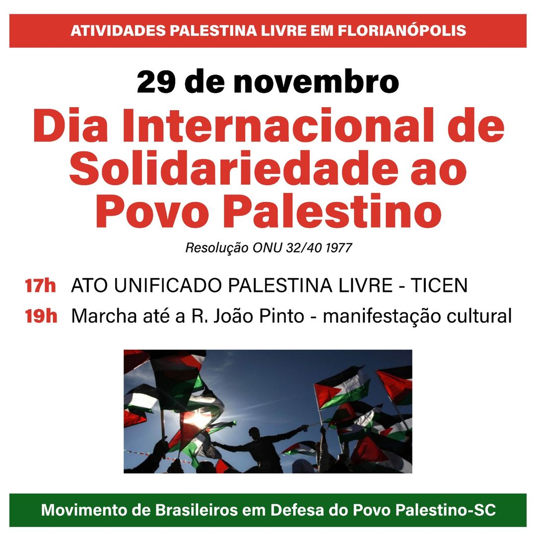 Nesta sexta-feira, dia 29, se celebra o Dia Internacional de Solidariedade ao Povo Palestino e haverá um ato público pelo fim do massacre de crianças, mulheres e jovens, bem como destruição de escolas, hospitais e acampamentos, cometido pelo estado de Israel em Gaza. Aqui em Florianópolis, o ato público será frente ao Ticen a partir das 17h, com uma marcha até a Rua João Pinto a partir das 19h.