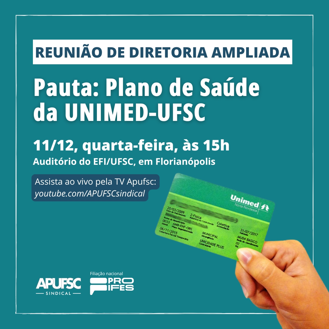 A Apufsc-Sindical convoca a comunidade docente da Universidade Federal de Santa Catarina (UFSC) para uma reunião de Diretoria ampliada acerca da situação do plano de saúde dos servidores no contrato com a Unimed. O debate acontece na quarta-feira, dia 11, a partir das 15h, no auditório do Espaço Físico Integrado (EFI), com transmissão ao vivo pelo canal da TV Apufsc.