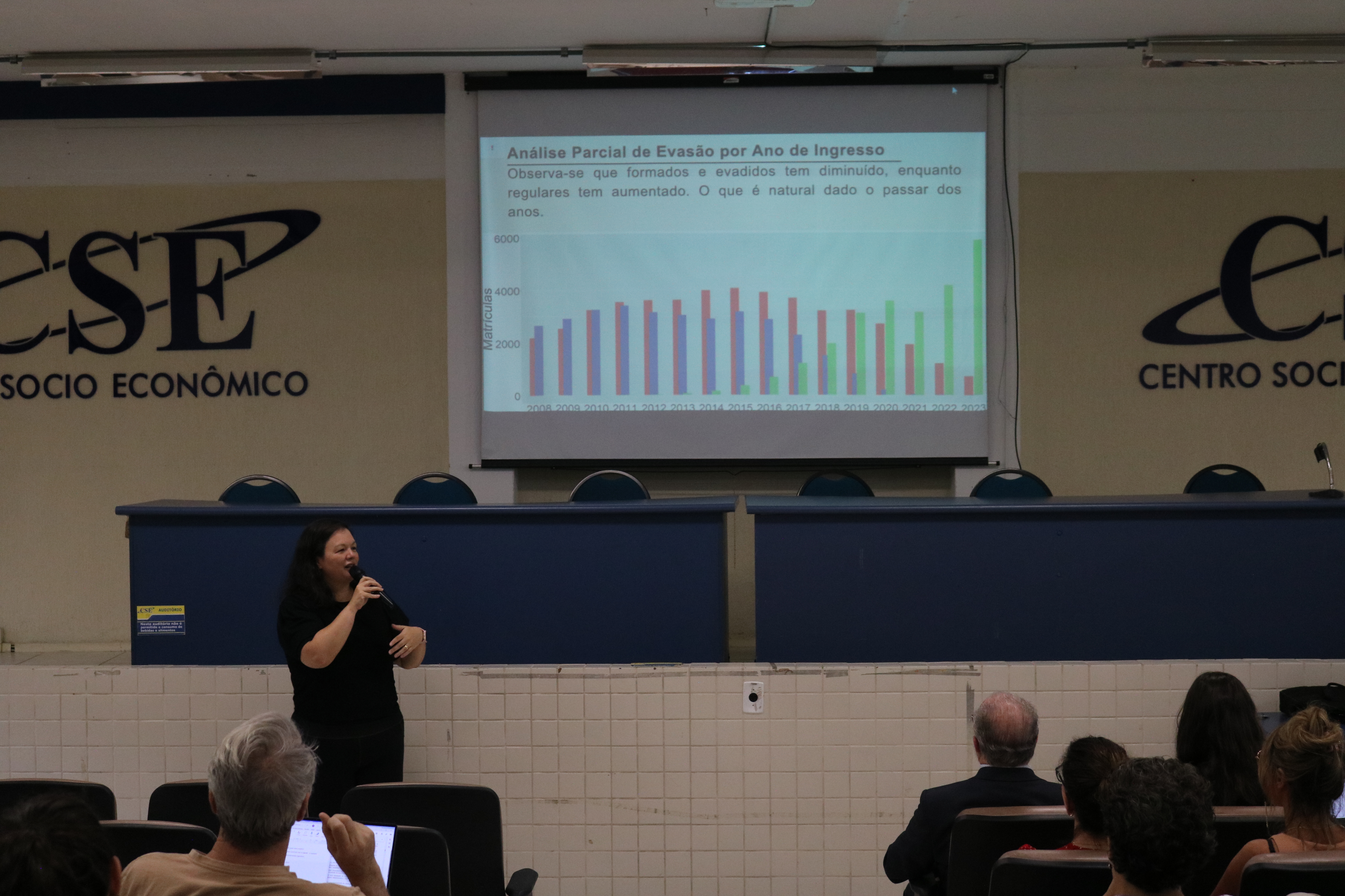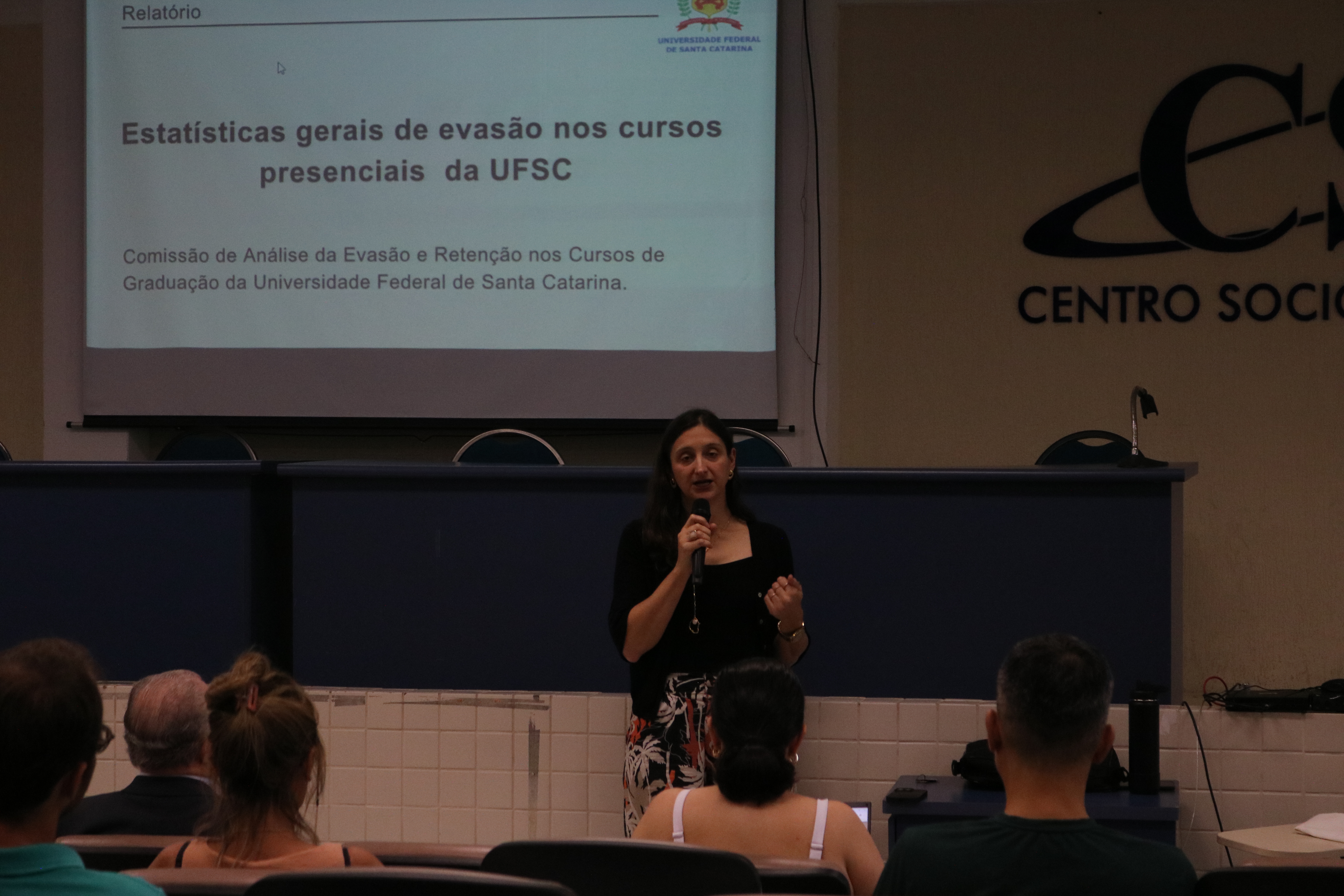 Os dados foram compilados e analisados pela Comissão de Análise da Evasão e Retenção nos Cursos de Graduação da UFSC, e apresentados em reunião realizada no auditório do Centro Socioeconômico (CSE). O reitor Irineu Manoel de Souza, a pró-reitora da Prograd, Dilceane Carraro, e a presidente da Comissão, Andressa Sasaki, estiveram presentes.