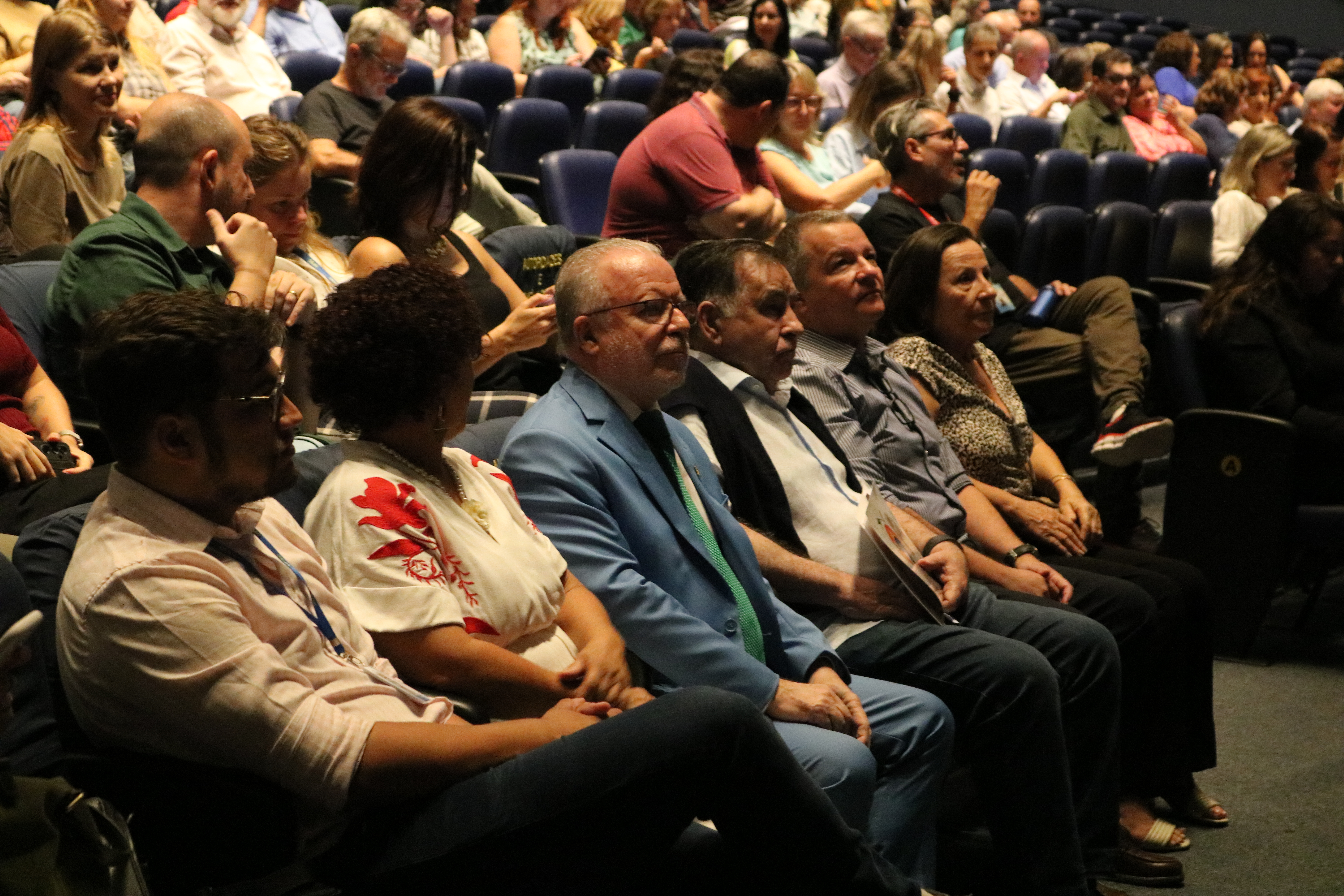 Gratidão e reconhecimento foram palavras bastante ouvidas na solenidade realizada nesta sexta-feira, dia 4, para homenagear os 439 servidores da Universidade Federal de Santa Catarina (UFSC) que se aposentaram entre os anos de 2021 e 2024. Muitos deles estiveram na cerimônia promovida pela Pró-reitoria de Desenvolvimento e Gestão de Pessoas (Prodegesp) no auditório Garapuvu, do Centro de Cultura e Eventos. O diretor de Assuntos de Aposentadoria da Apufsc-Sindical, Wilson Erbs, esteve presente na solenidade.