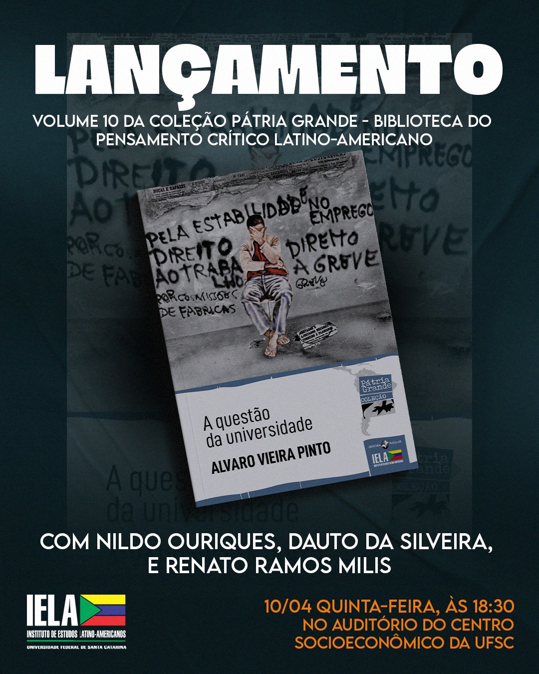 Nesta quinta-feira, dia 10, será lançado o 10° volume da Coleção Pátria Grande, a Biblioteca do Pensamento Crítico do Instituto de Estudos Latino-Americanos (Iela), pela Editora Insular. Conforme o professor Nildo Ouriques, presidente do Iela, trata-se de “um clássico sobre a universidade brasileira”: o livro “A questão da universidade”, de autoria de Álvaro Vieira Pinto. O lançamento será no auditório do Centro Socioeconômico da Universidade Federal de Santa Catarina (CSE/UFSC), às 18h30, e terá a participação de Ouriques, de Dauto da Silveira, que escreveu o prefácio desta edição, e de Renato Ramos Milis, diretor do Sintufsc.