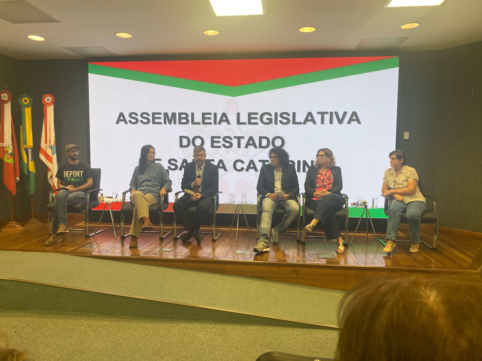 Nesta quarta-feira, dia 23, ocorreu o evento de divulgação do relatório do estudo “Jornalismo local e democracia: como Floripa se informa?”, realizada por pesquisadores da Universidade Federal de Santa Catarina (UFSC), no Plenarinho da Assembleia Legislativa de Santa Catarina (Alesc). Os resultados foram apresentados pela equipe coordenada por Samuel Pantoja Lima, professor do Departamento de Jornalismo, Jacques Mick, pró-reitor de Pesquisa e Inovação da universidade, e a pesquisadora de pós-doutorado Andressa Kikuti. O professor Carlos Augusto Locatelli, coordenador do Programa de Pós-Graduação em Jornalismo da UFSC também participou do debate. Viviane Maria Heberle, ex-diretora da Apufsc-Sindical, representou o sindicato.