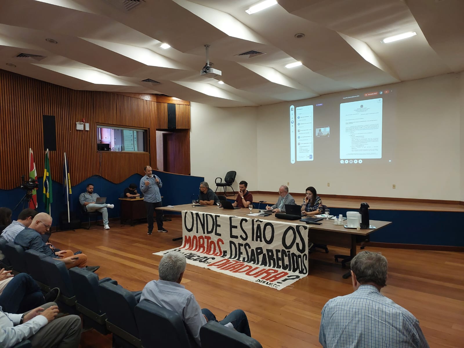 A sessão deu continuidade ao debate iniciado na última semana a respeito do relatório final apresentado pela Comissão de Encaminhamentos do Relatório da Comissão Memória e Verdade (CER/CMV) da UFSC. Houve a releitura do parecer, seguindo as devidas alterações incluídas pelo relator, que acatou algumas das sugestões feitas pelo conselho.