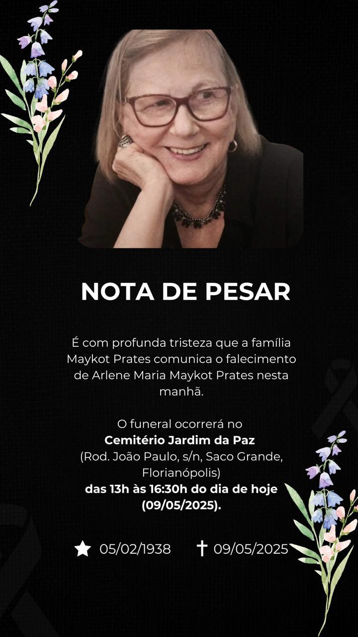 Faleceu nesta sexta-feira, dia 9, a professora aposentada do departamento de Geociências da Universidade Federal de Santa Catarina (UFSC) Arlene Maria Maykot Prates. O funeral acontece ainda hoje, no Cemitério Jardim da Paz, no bairro do Saco Grande, em Florianópolis, entre 13h e 16h30.