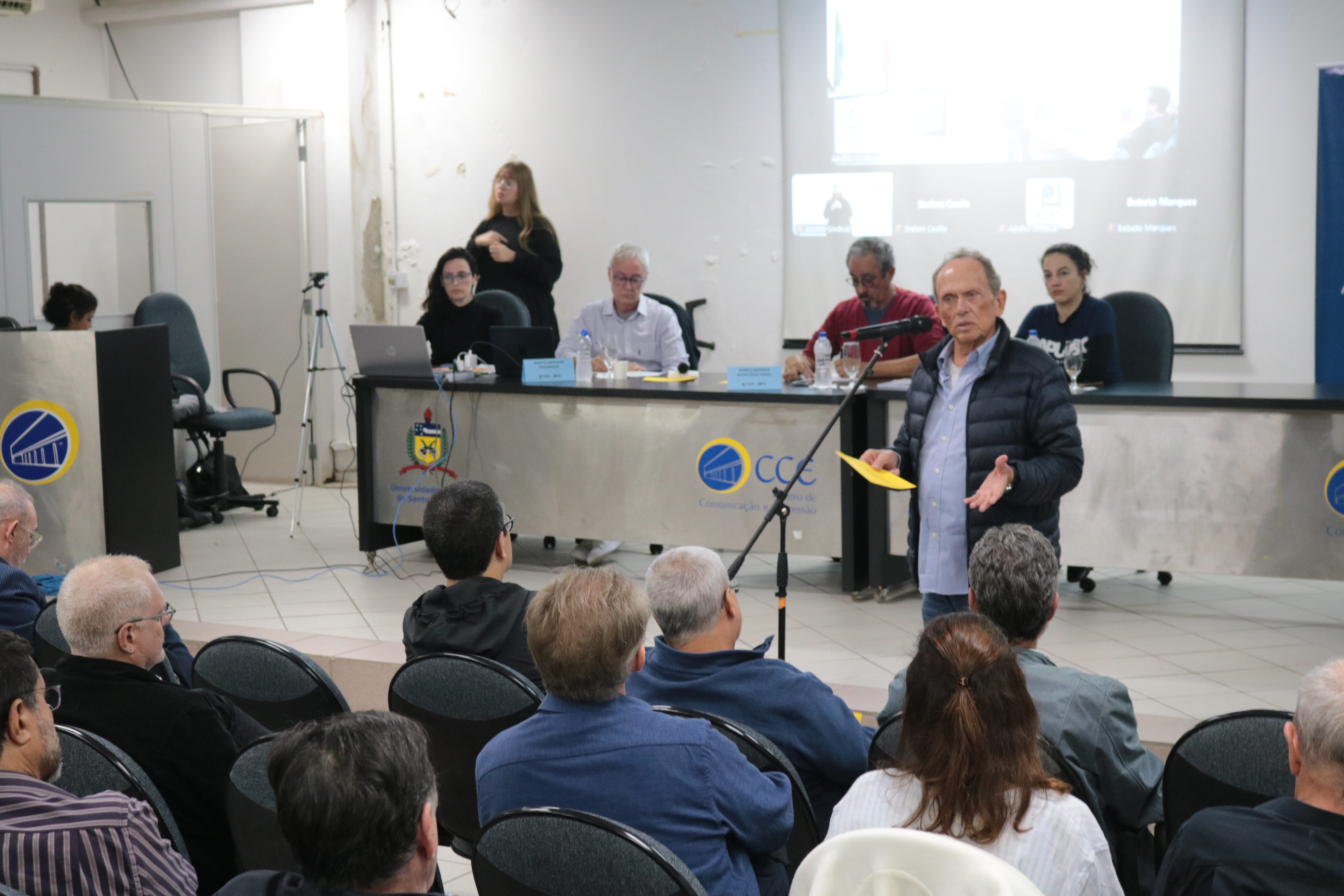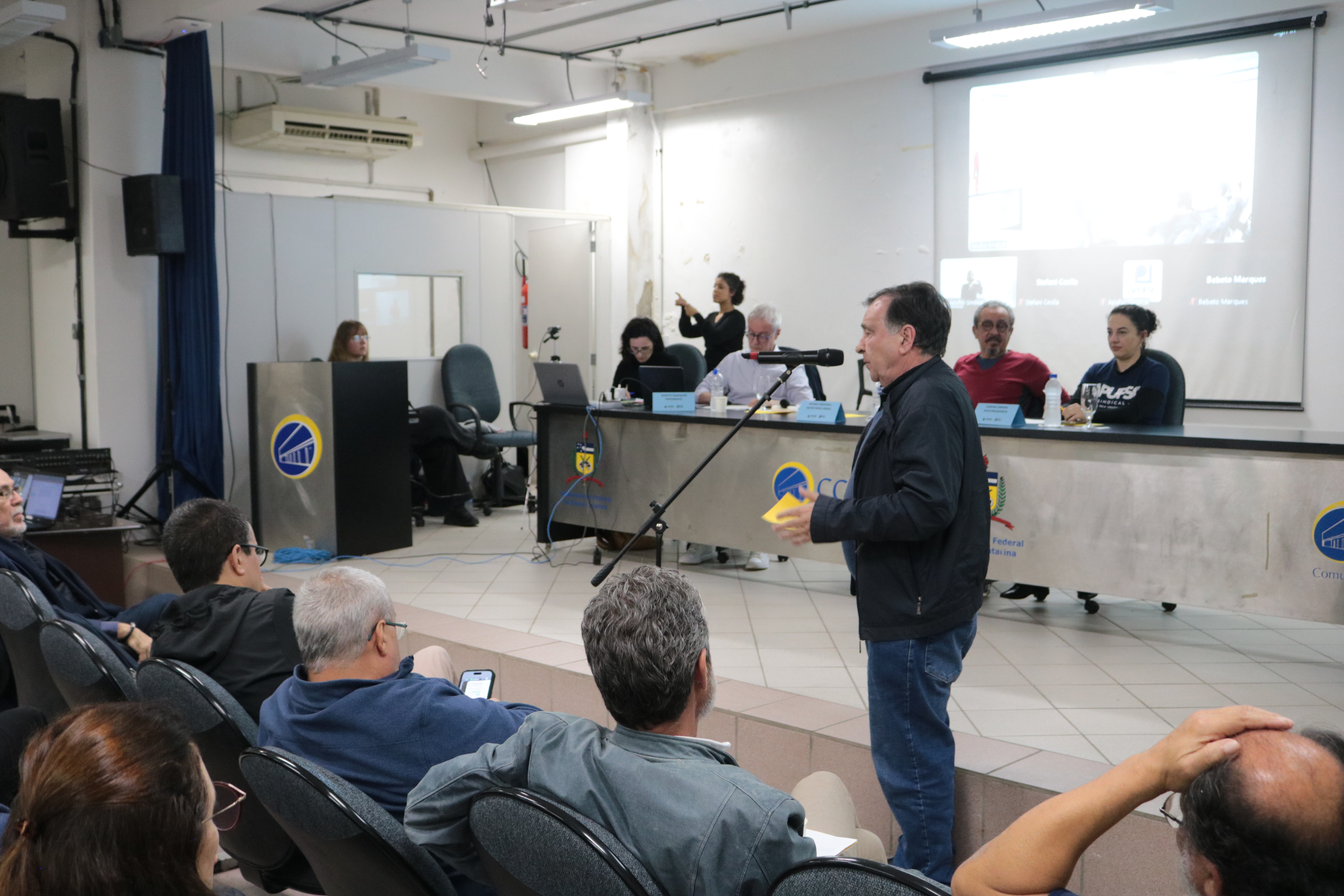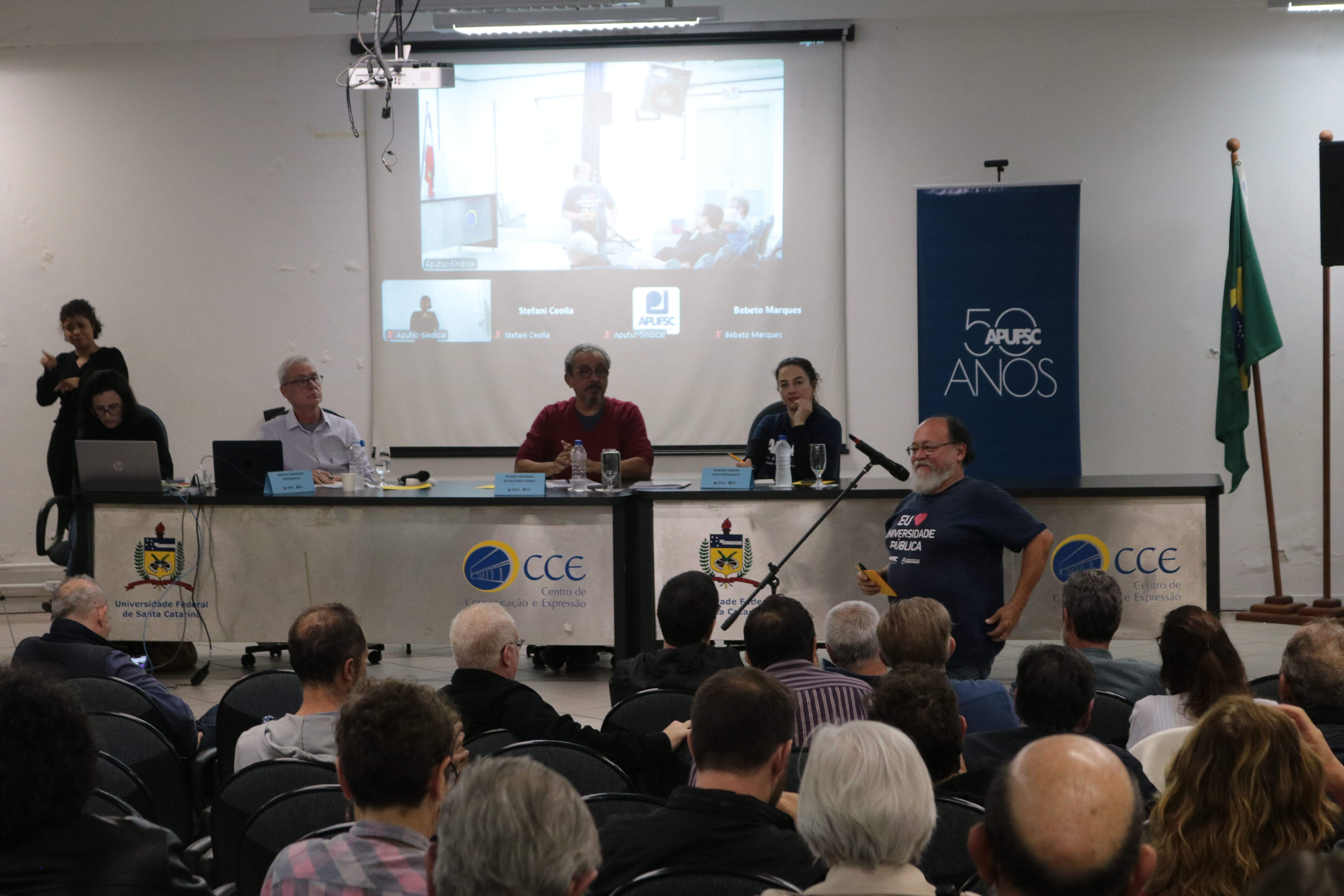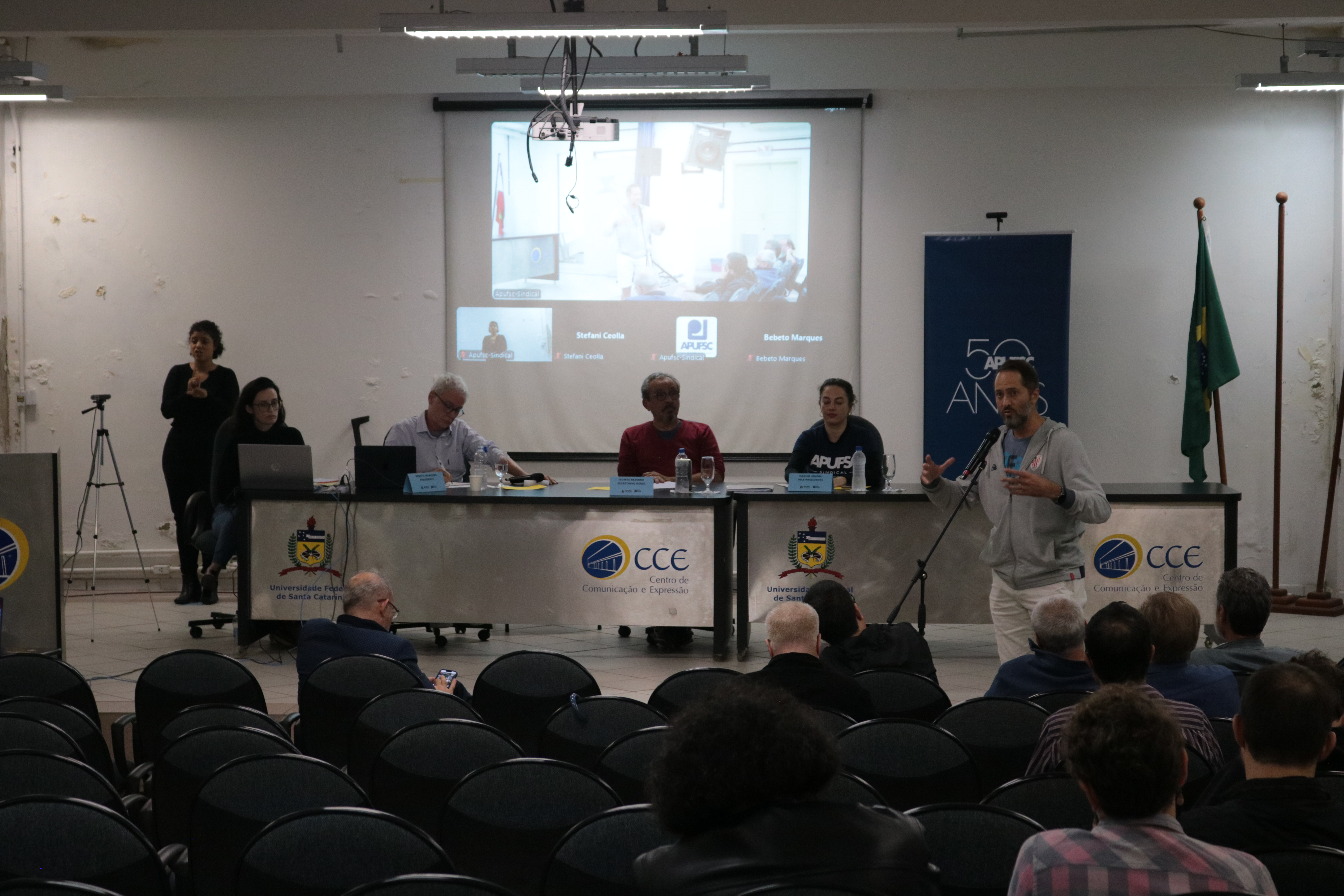 “Estamos propondo que essa assembleia tenha de dois a três momentos. A ideia é subsidiar encaminhamentos com informação qualitativa. Hoje vamos fazer um breve histórico, depois a gente abre para as diretorias anteriores explicarem o que aconteceu com a sede naquele período. Já convidamos a Reitoria para um segundo momento, em que ela vai ter espaço para esclarecer e apresentar suas propostas”, resumiu o presidente da Apufsc, Bebeto Marques, ao abrir os trabalhos.
