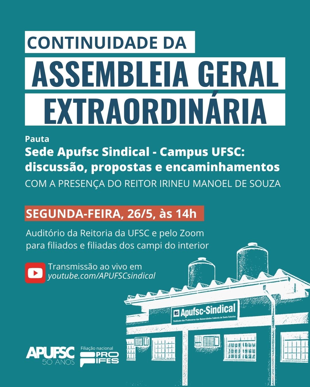 A assembleia continua na segunda-feira, dia 26, às 14h, no auditório da Reitoria da UFSC, com presença confirmada do reitor Irineu Manoel de Souza.