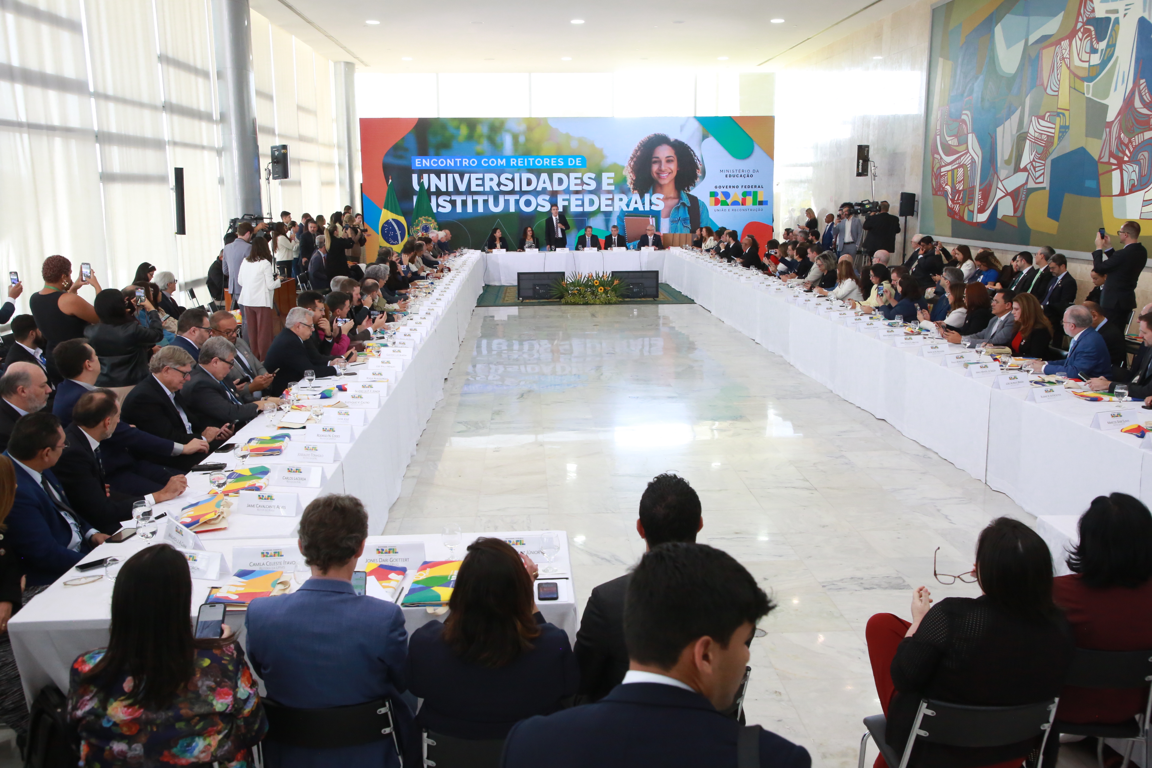 O reitor da Universidade Federal de Santa Catarina (UFSC), Irineu Manoel de Souza, participou da reunião em Brasília que contou também com a presença dos ministros da Fazenda, Fernando Haddad; da Ciência, Tecnologia e Inovação, Luciana Santos; e do ministro-chefe da Secretaria-Geral da Presidência da República, Márcio Macêdo, ao lado da presidente do Conselho Nacional das Instituições da Rede Federal de Educação Profissional, Científica e Tecnológica (Conif) e reitora do Colégio Pedro II, Ana Paula Giraux; e do presidente da Associação Nacional dos Dirigentes das Instituições Federais de Ensino Superior (Andifes) e reitor da Universidade Federal do Rio Grande do Norte (UFRN), José Daniel Diniz Melo.