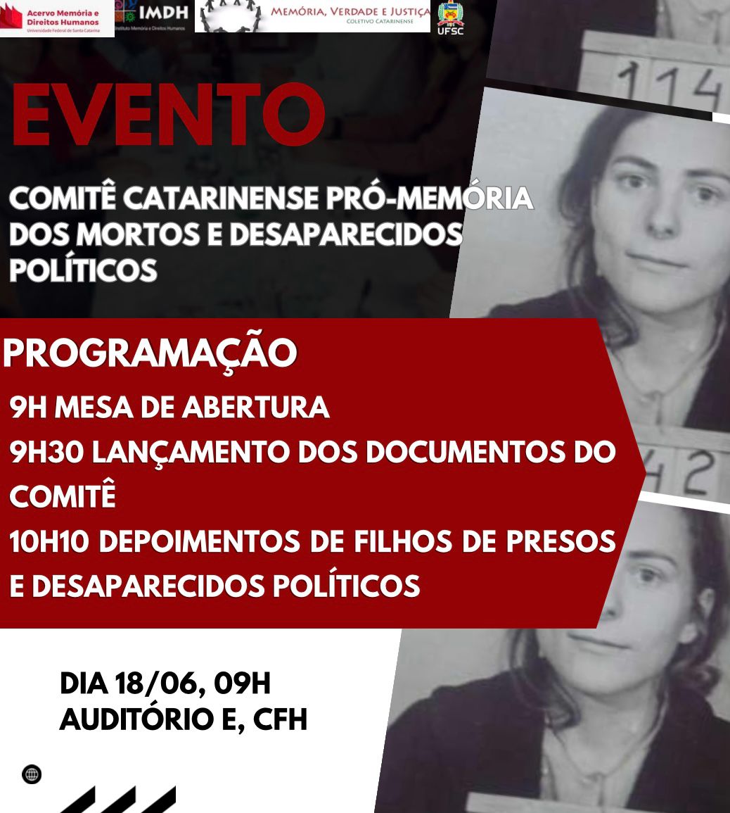 A equipe do Acervo Memória e Direitos Humanos do Instituto de Memória e Direitos Humanos (IMDH) da Universidade Federal de Santa Catarina (UFSC) realiza no dia 18 de junho, às 9h, o lançamento da Coleção Comitê Catarinense Pró-Memória dos Mortos e Desaparecidos Políticos. O evento será no auditório do bloco E do CFH. Serão disponibilizados ao público os documentos digitalizados e tratados que registram a atuação do comitê, criado em 1983 e coordenado por Derlei Catarina de Luca.