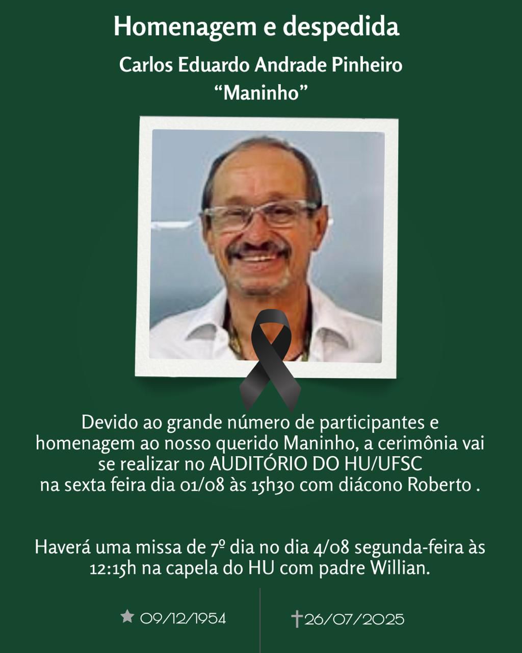 Nesta sexta-feira, dia 1°, a Universidade Federal de Santa Catarina (UFSC) realiza uma cerimônia em homenagem ao professor Carlos Eduardo Andrade Pinheiro, o Maninho. A solenidade acontece a partir das 15h30 no Auditório do Hospital Universitário Polydoro Ernani de São Thiago (HU/UFSC). O culto ecumênico será realizado pelo padre Roberto e toda a comunidade está convidada.