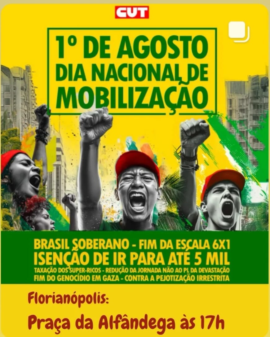 Nesta sexta-feira, dia 1°, acontece o Dia Nacional da Mobilização organizado pela Central Única dos Trabalhadores (CUT). Em Florianópolis, o ponto de partida do ato será na Praça da Alfândega, a partir das 17h.