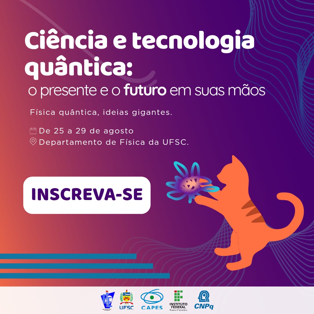 O Departamento de Física da Universidade Federal de Santa Catarina (UFSC) realiza, entre os dias 25 e 29 de agosto, o evento “Ciência e Tecnologia Quântica: o presente e o futuro em suas mãos!”. As atividades serão realizadas no período entre 9h e 17h de forma gratuita. Para participar, é preciso preencher o formulário de inscrição. Estão disponíveis 200 vagas, que serão preenchidas por ordem de inscrição e confirmação.