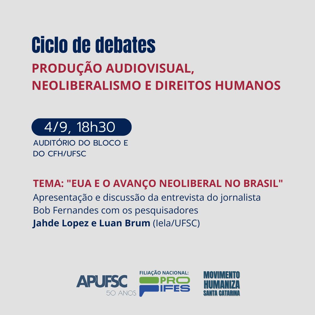 O Instituto Humaniza Santa Catarina e a Apufsc-Sindical promovem um ciclo de debates sobre produção audiovisual, neoliberalismo e direitos humanos. O primeiro evento será na próxima quinta-feira, dia 4, às 18h30, no auditório do bloco E do Centro de Filosofia e Ciências Humanas (CFH) da Universidade Federal de Santa Catarina (UFSC) com o tema “EUA e o avanço neoliberal no Brasil”.