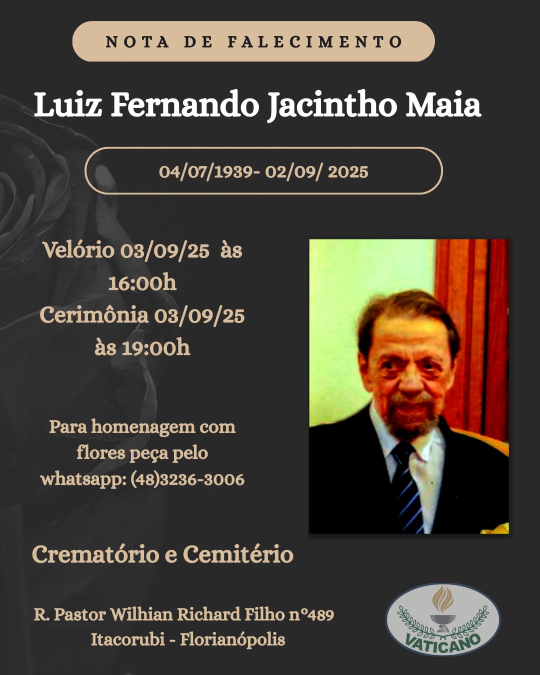 O velório acontece nesta quarta-feira, dia 3, às 16h, no Cemitério Vaticano, no bairro Itacorubi, em Florianópolis. A cerimônia de despedida será às 19h, no mesmo local.