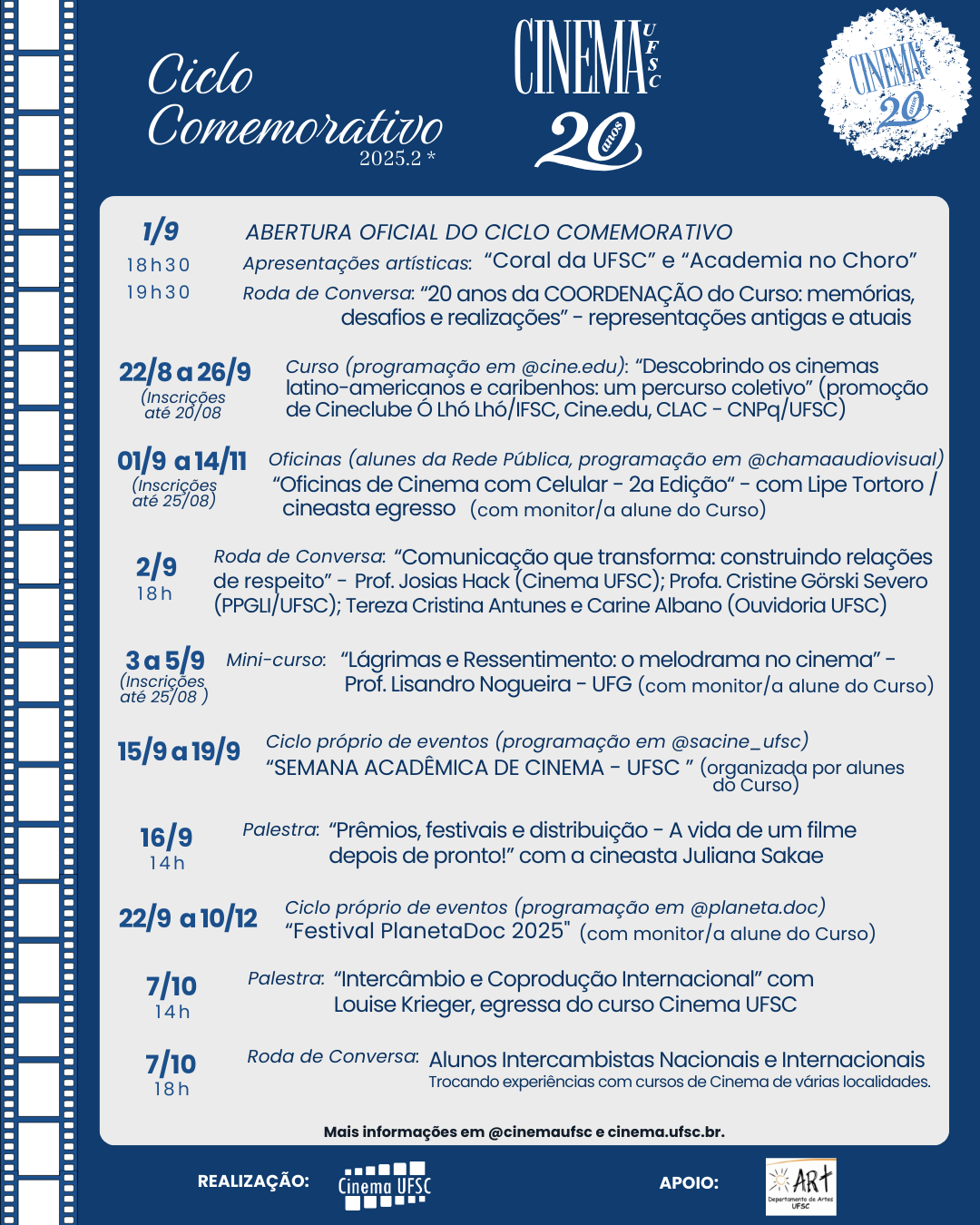 O Ciclo Comemorativo – 20 Anos do Curso de Cinema UFSC teve início em agosto e foi oficialmente lançado em 1º de setembro. A programação incluiu a participação do professor Mauro Pommer, o primeiro coordenador do curso, da Ouvidoria da UFSC e de docentes do curso, além de apresentações musicais do Coral da UFSC e da Academia no Choro e de oficinas e cursos sobre cinema para discentes e públicos diversos, internos e externos.