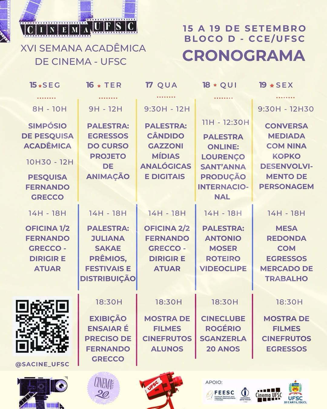 O curso de Cinema da Universidade Federal de Santa Catarina (UFSC), o primeiro de Artes da Universidade, está celebrando duas décadas de existência com uma série de eventos. Além das atividades já realizadas, o ciclo se unirá à XVI Semana Acadêmica do Cinema UFSC. O evento contará com a presença de egressos de destaque no mercado, como o primeiro aluno indígena do curso, Ítalo Mongconán, além de palestrantes externos.