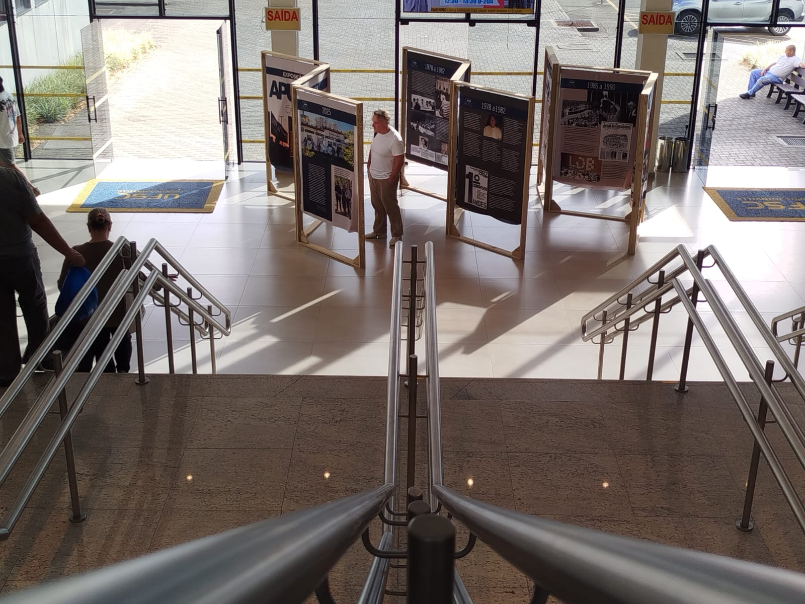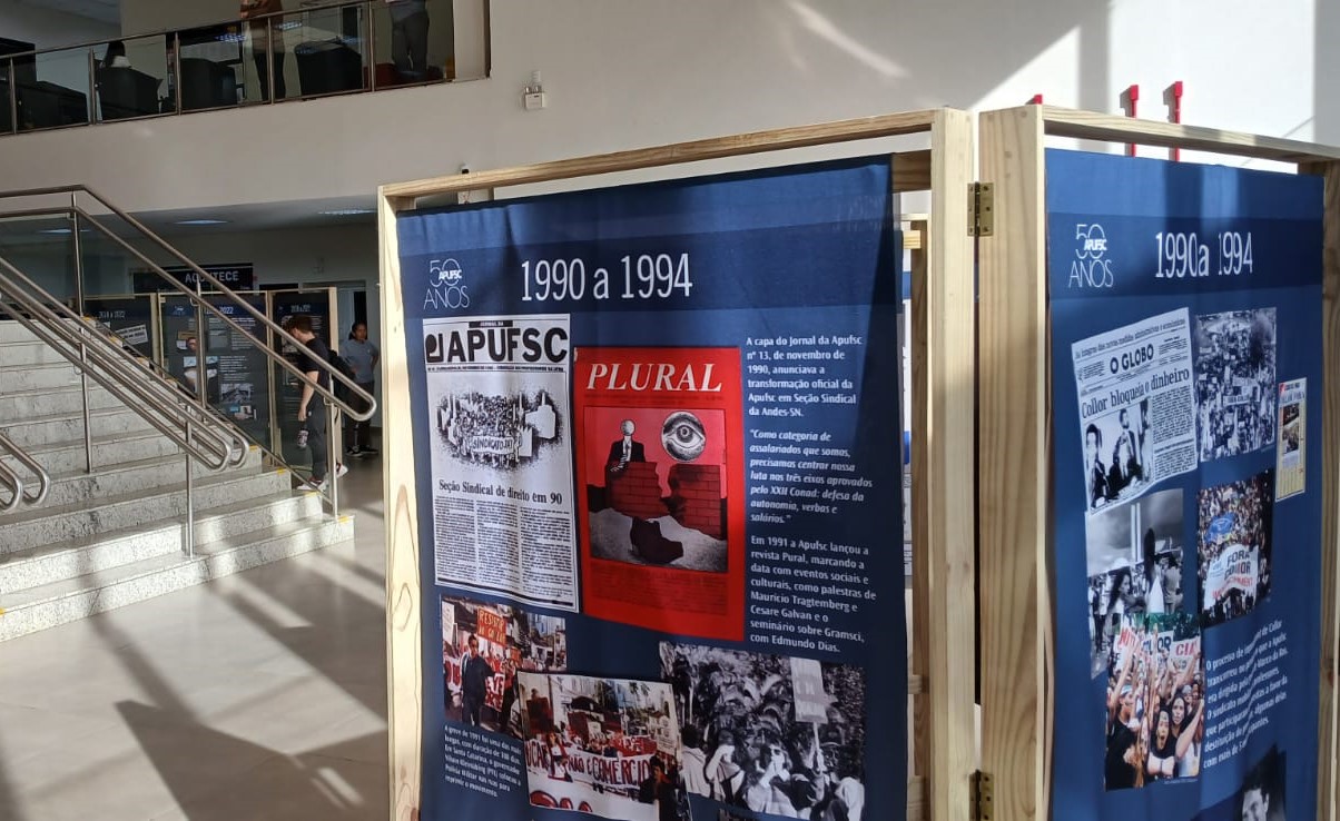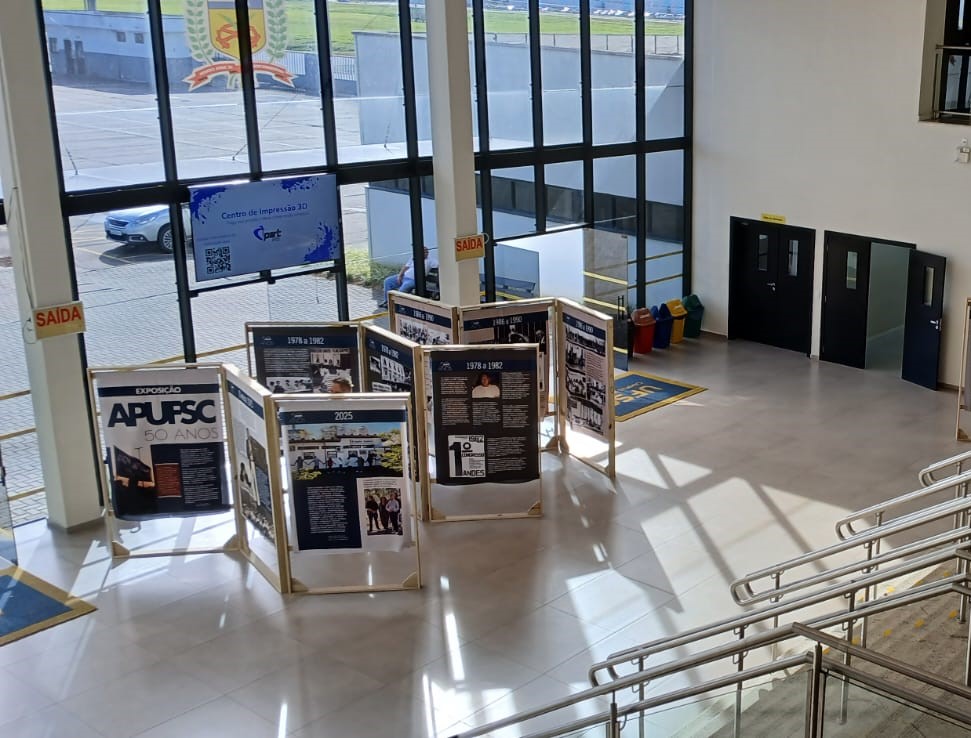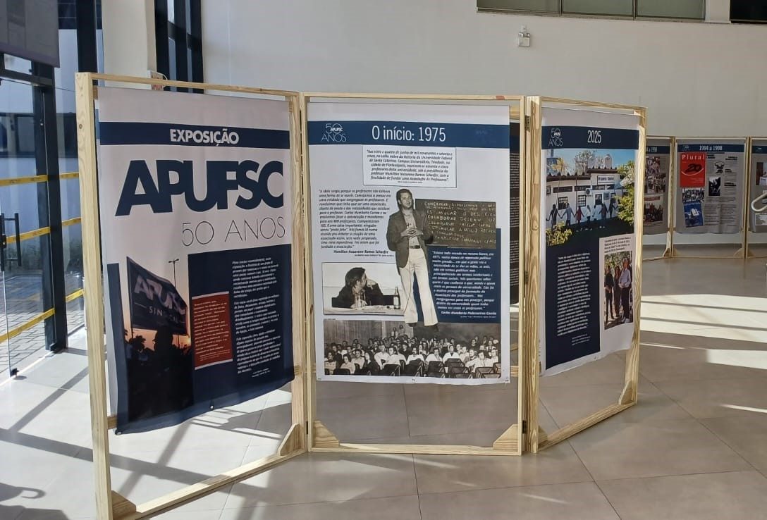 A exposição itinerante que conta a história dos 50 anos da Apufsc-Sindical chegou ao campus da Universidade Federal de Santa Catarina (UFSC) em Joinville nesta quinta-feira, dia 18. Os painéis estão dispostos entorno da escadaria principal do Bloco U, onde também é localizado o hall de entrada do campus. A expectativa é que a exposição permaneça em Joinville por cerca de três semanas. O evento de abertura, com presença da Diretoria do sindicato, deve ser divulgado nos próximos dias. Toda a comunidade acadêmica está convidada a prestigiar a celebração.
